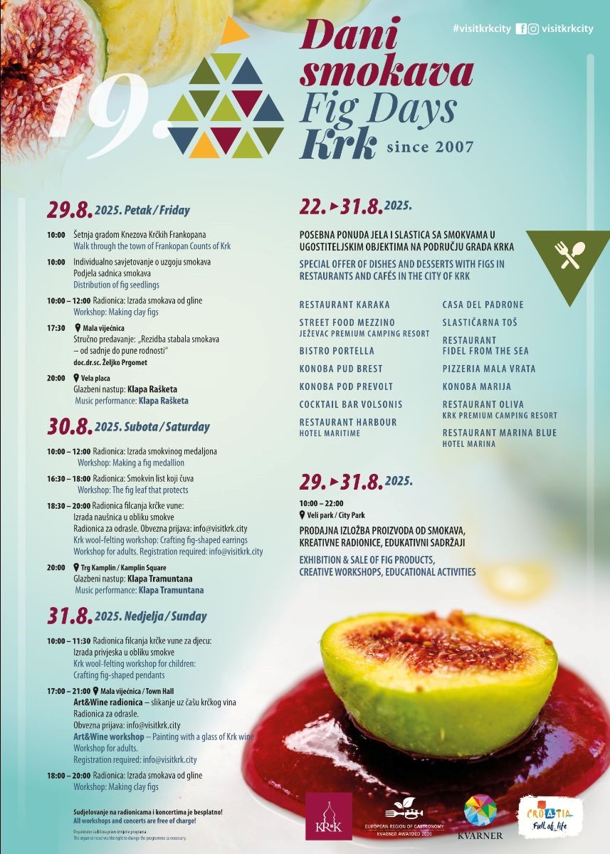 Smokva, vječni simbol Mediterana i nezaobilazan dio otočne prehrane kroz stoljeća, i ove će godine biti u središtu zbivanja, povezujući bogat program edukacije, kreativnih radionica, gastronomskih užitaka i glazbenih nastupa. Ove se godine manifestacija posebno uklapa u širu regionalnu priču budući da je Kvarner proglašen Europskom regijom gastronomije 2026, što dodatno potvrđuje njegovu ulogu centra održivog razvoja, gastronomske izvrsnosti i međusektorske suradnje. Dani smokava učvršćuju poziciju grada Krka kao autentične destinacije gdje se tradicionalno i suvremeno ne samo susreću, već i nadopunjuju.