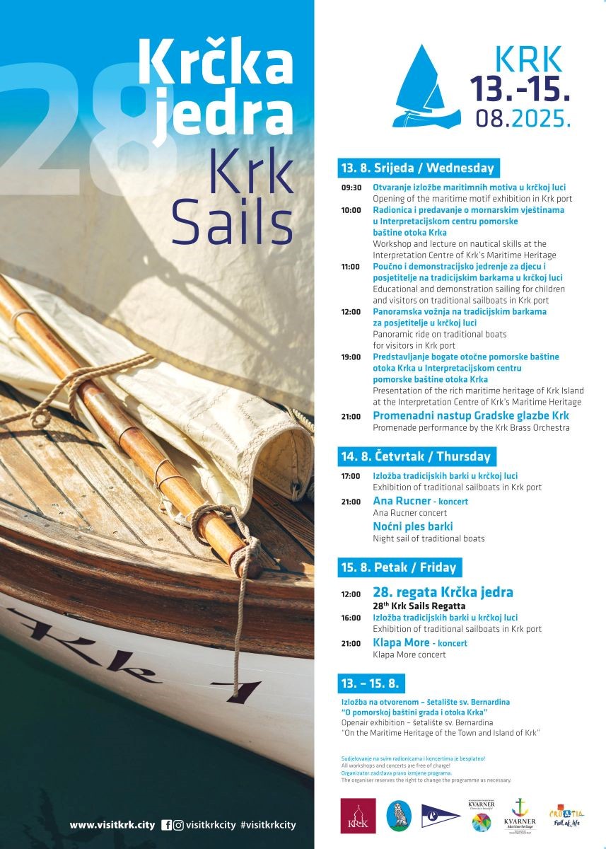 Krčka jedra, koja su po prvi put zaplovila još 1998. godine, zahvaljujući entuzijazmu i viziji članova Jedriličarskog kluba Plav iz Krka – najstarijeg jedriličarskog društva na Jadranu, osnovanog davne 1876. godine – i ove će godine, po 28. put, oživjeti bogatu pomorsku baštinu otoka Krka. Ova višednevna manifestacija tradicionalno okuplja brojne posjetitelje kroz sportske, kulturne, edukativne i zabavne sadržaje inspirirane morem, jedrenjem i pomorskom poviješću. Poseban doprinos programu daje Interpretacijski centar pomorske baštine otoka Krka, koji kroz radionice, predavanja i izložbe približava tradiciju brodogradnje, ribarstva i mornarskih vještina svim generacijama.