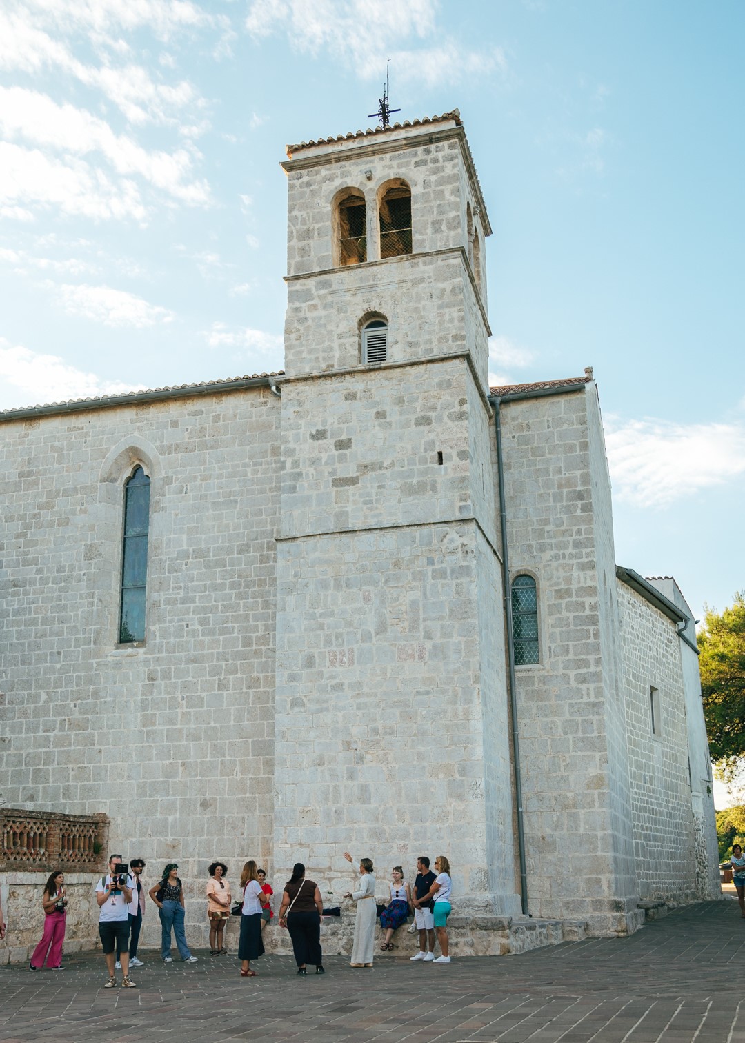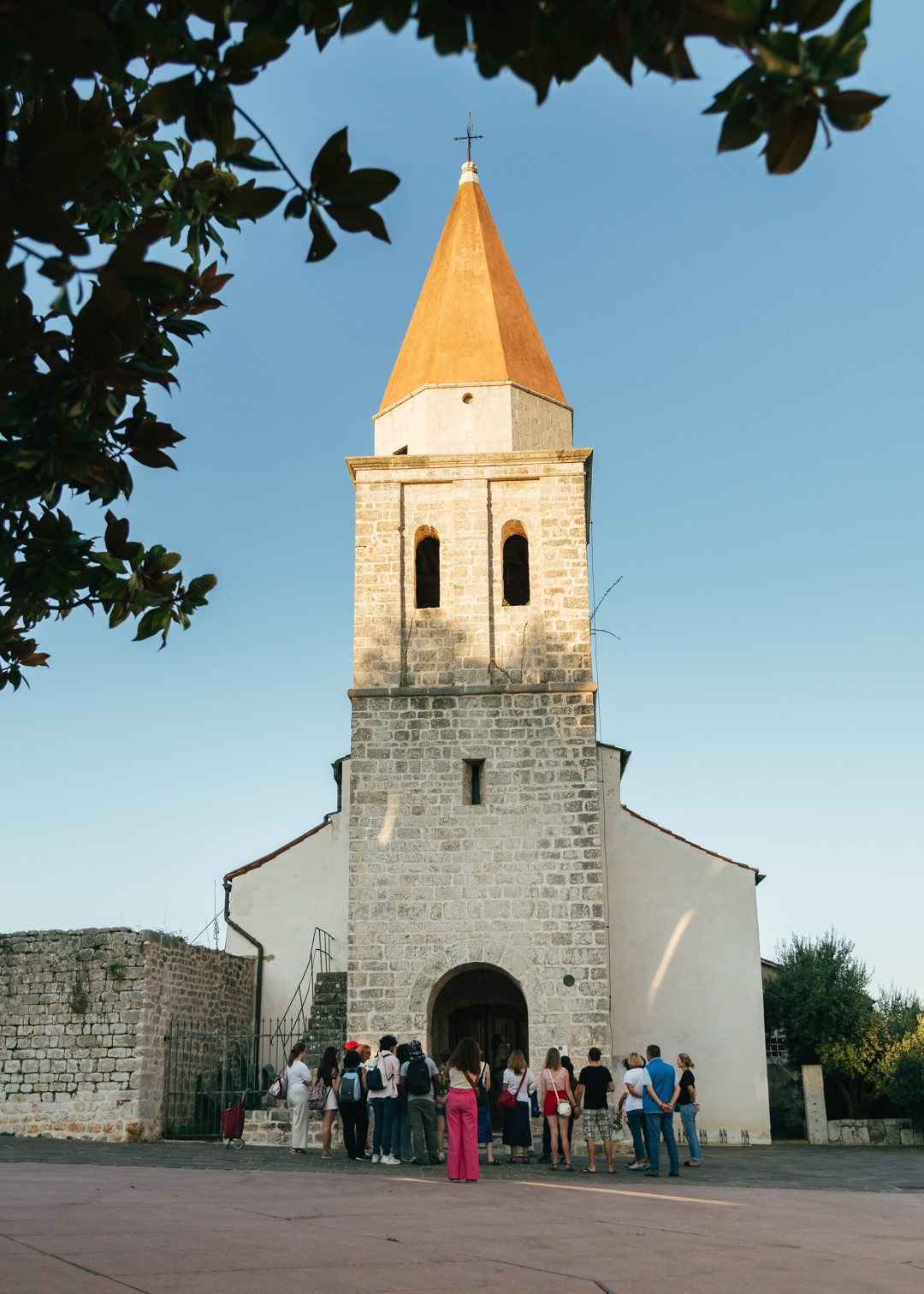 Šetnje započinju na Trgu krčkih glagoljaša, kojim dominira romanička Crkva Majke Božje od zdravlja. Ova impozantna crkva, koja je do sredine 19. stoljeća bila posvećena sv. Mihovilu, sada nam pruža nevjerojatnu priliku za istraživanje. U vrijeme kada je kolera harala, promjena zaštitnika crkve postala je simbol nade i zaštite, čime je ova lokacija danas idealna za pripovijedanje o načinima na koje su naši preci, stoljećima unazad, brinuli o svome zdravlju, liječeći se i autohtonim samoniklim biljem. Put nas zatim vodi do suvremenog sjedišta glazbene škole, gdje će nas dočekati zvukovi i priče o glazbenom naslijeđu otoka. Ovdje ćemo otkriti kako običan komad drva može postati čarobni instrument zahvaljujući vještini ljudskih ruku, pokazujući kako priroda inspirira umjetnost i stvaranje.