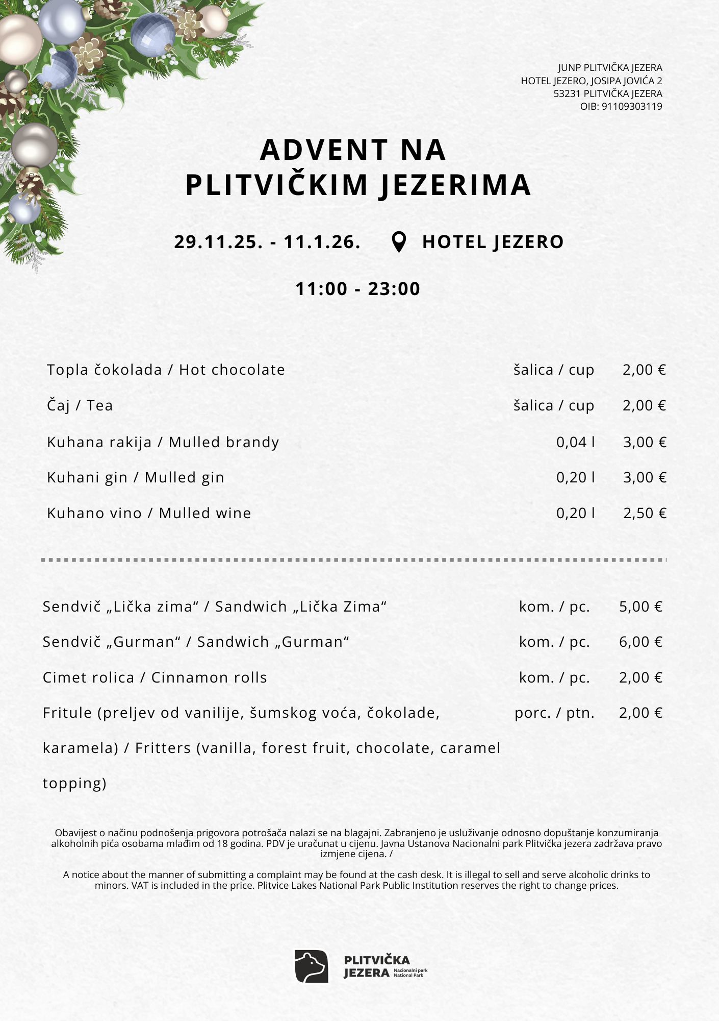 Pozivamo vas da doživite čaroliju Adventa na Plitvičkim jezerima, okruženi očaravajućom prirodom, blagdanskim mirisima i bajkovitom zimskom atmosferom u samom srcu Nacionalnog parka. Adventsku gastro ponudu na Plitvičkim jezerima moći ćete kušati u Zimskom vrtu hotela Jezero, u razdoblju od 29.11.2025. do 11.1.2026. godine.