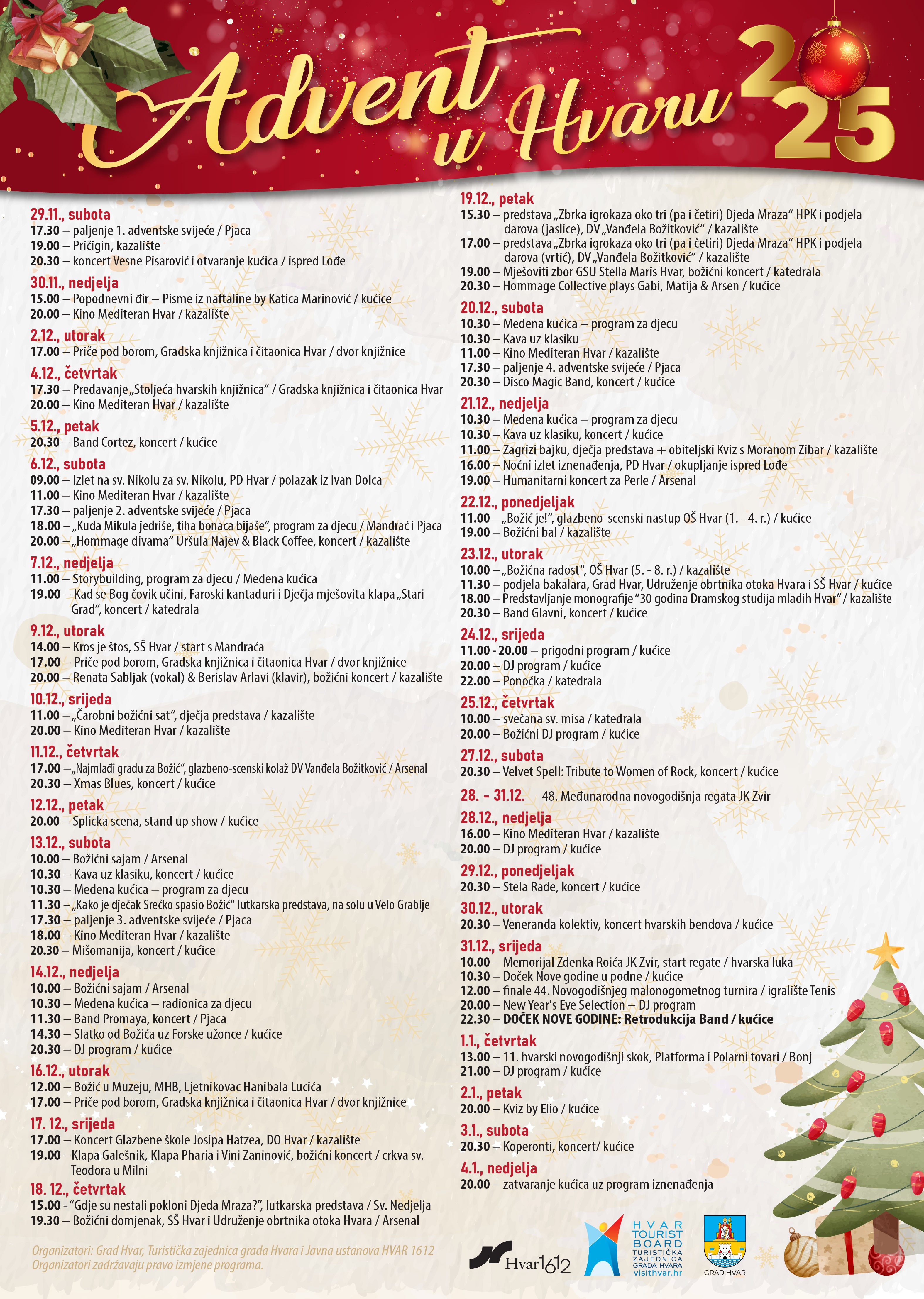 Božićno-novogodišnji program u gradu Hvaru i ove će godine donijeti bogat i raznolik sadržaj na više lokacija u gradu. Grad Hvar, Turistička zajednica grada Hvara i Javna ustanova u kulturi HVAR 1612, u suradnji s gradskim udrugama, društvima, ustanovama i Župom Hvar, pripremili su program namijenjen svim generacijama kako bi zajednici i posjetiteljima pružili dodatne razloge za druženje, radost i blagdanski duh.