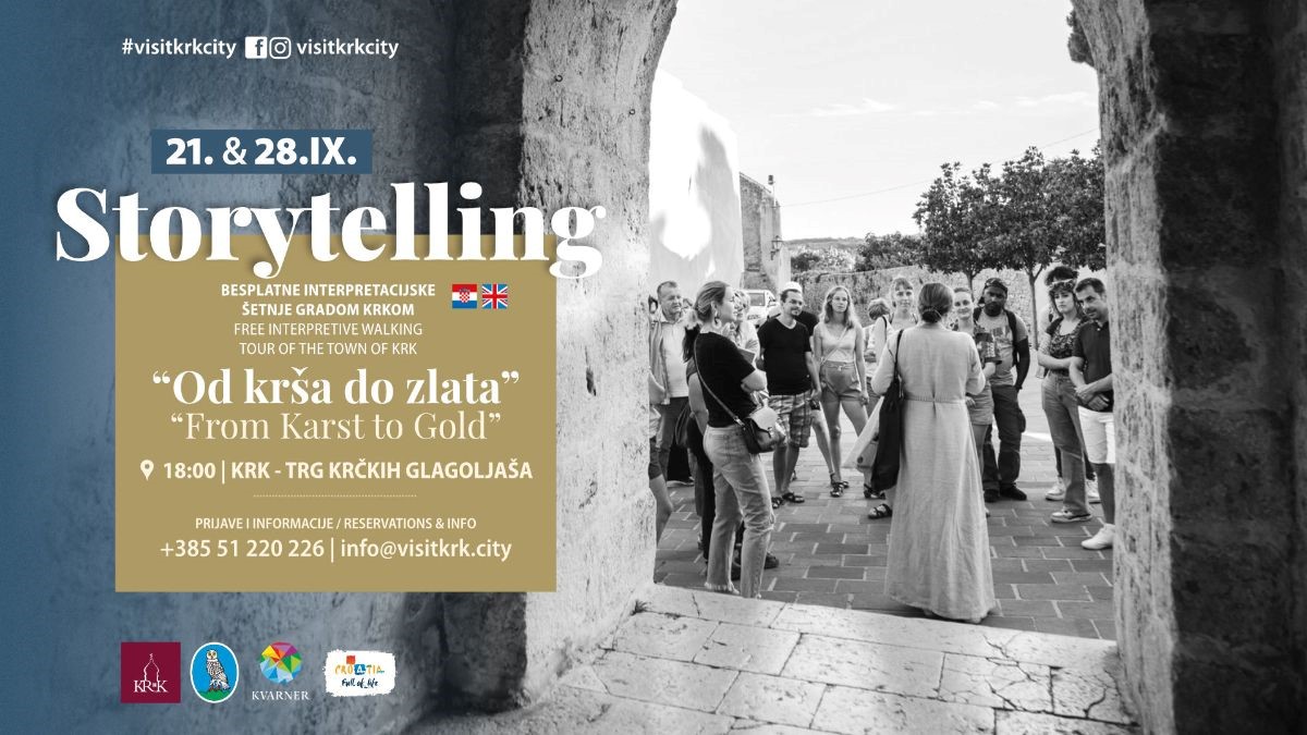 Kroz dvije posebne rujanske nedjelje pozivamo vas na jedinstveno putovanje kroz staru gradsku jezgru Krka – interpretacijsku šetnju "Od krša do zlata". Ova besplatna tura nije tek običan obilazak, već priča koja grad pretvara u živu pozornicu, a njegove ulice u vodiče kroz stoljeća povijesti, umjetnosti i svakodnevnog života.