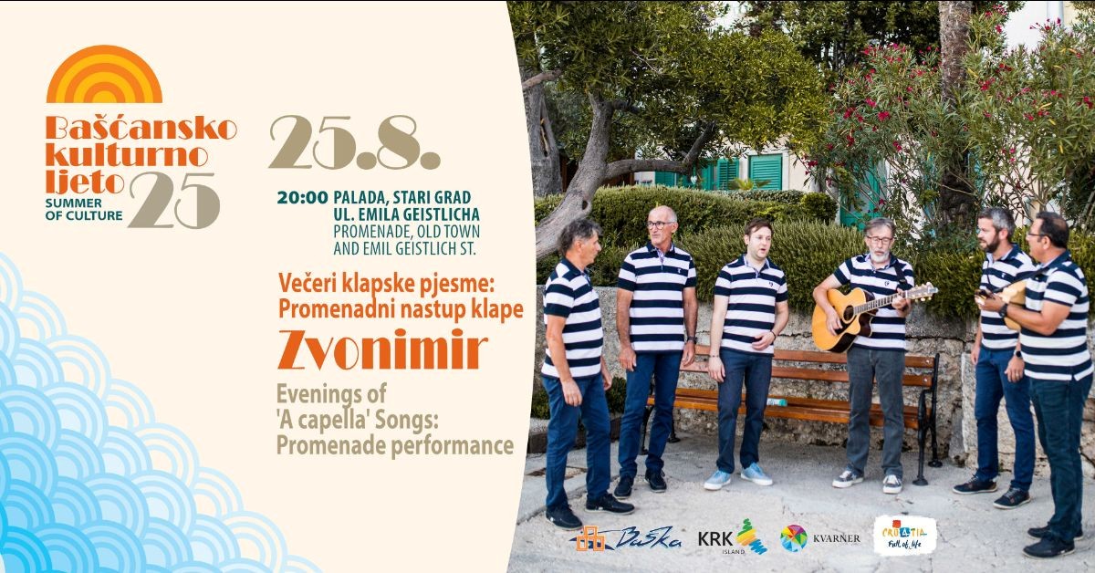 U ponedjeljak, 25. kolovoza, zaključujemo ciklus Večeri klapske pjesme promenadnim nastupom Klape Zvonimir. Zvuci klapske pjesme najprije će odjekivati na Paladi, a potom će ispuniti ulice starog grada i Ulicu Emila Geistlicha. Autentična izvedba u ljetnoj večeri još jednom potvrđuje ljepotu nematerijalne kulturne baštine te donosi poseban ugođaj Baške svim posjetiteljima.