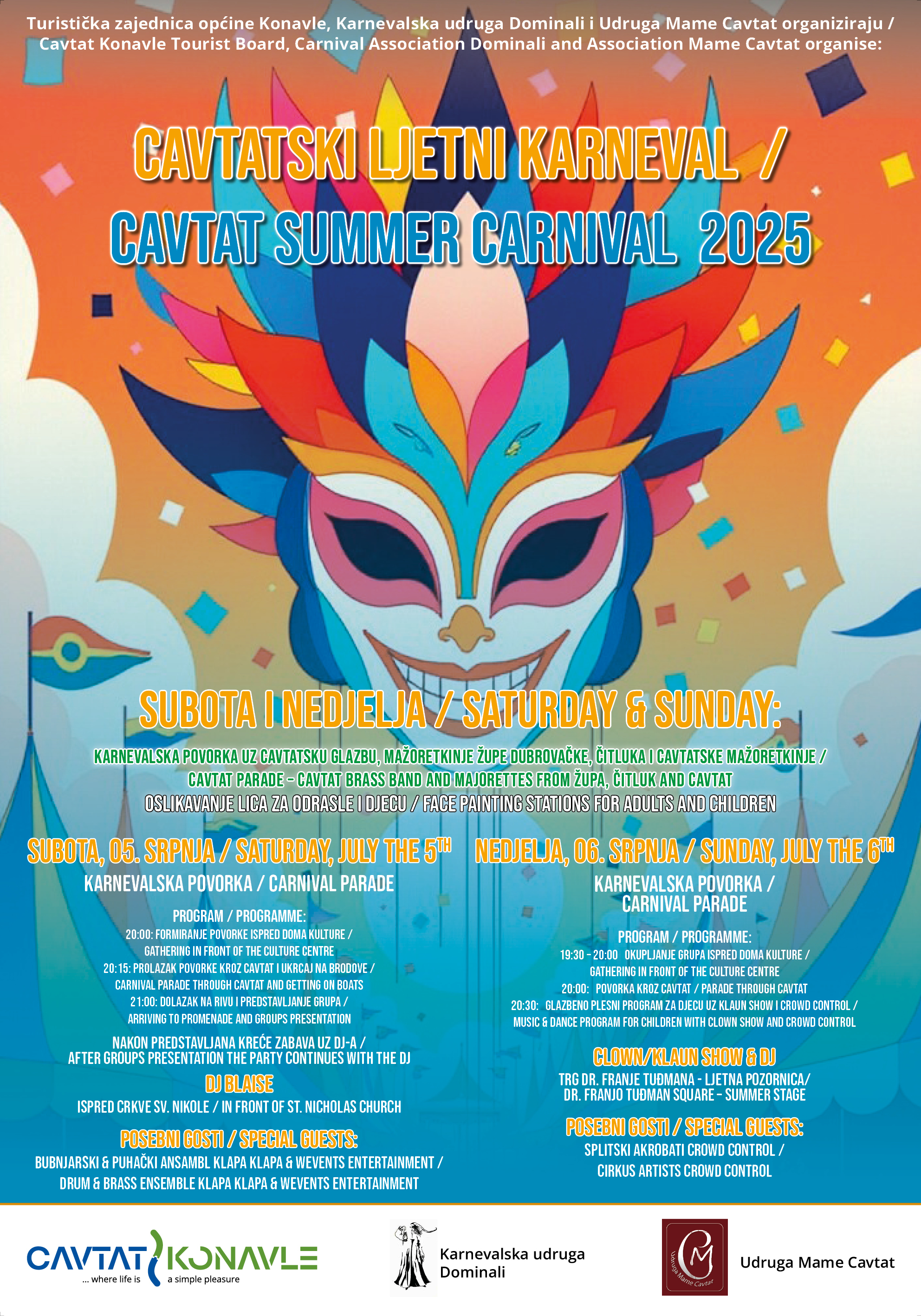 Ne propustite izvaditi svoje maske i pridružiti nam se – Cavtat vas čeka razigran, s karnevalskim šušurom, glazbom i dobrom energijom na svakom koraku!