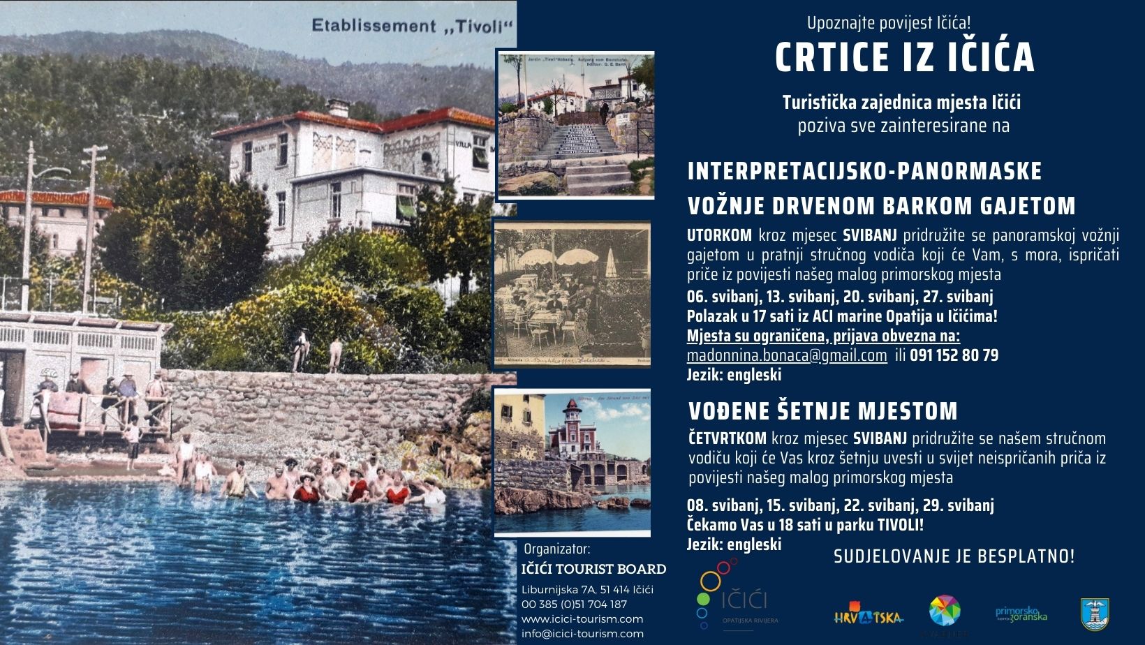 Turistička zajednica mjesta Ičići u sklopu projekta CRTICE IZ IČIĆA poziva sve zainteresirane da sudjeluju u organiziranim interpretacijsko - panormaskim vožnjama drvenom barkom GAJETOM ili vođenim šetnjama mjestom tokom mjeseca svibnja.