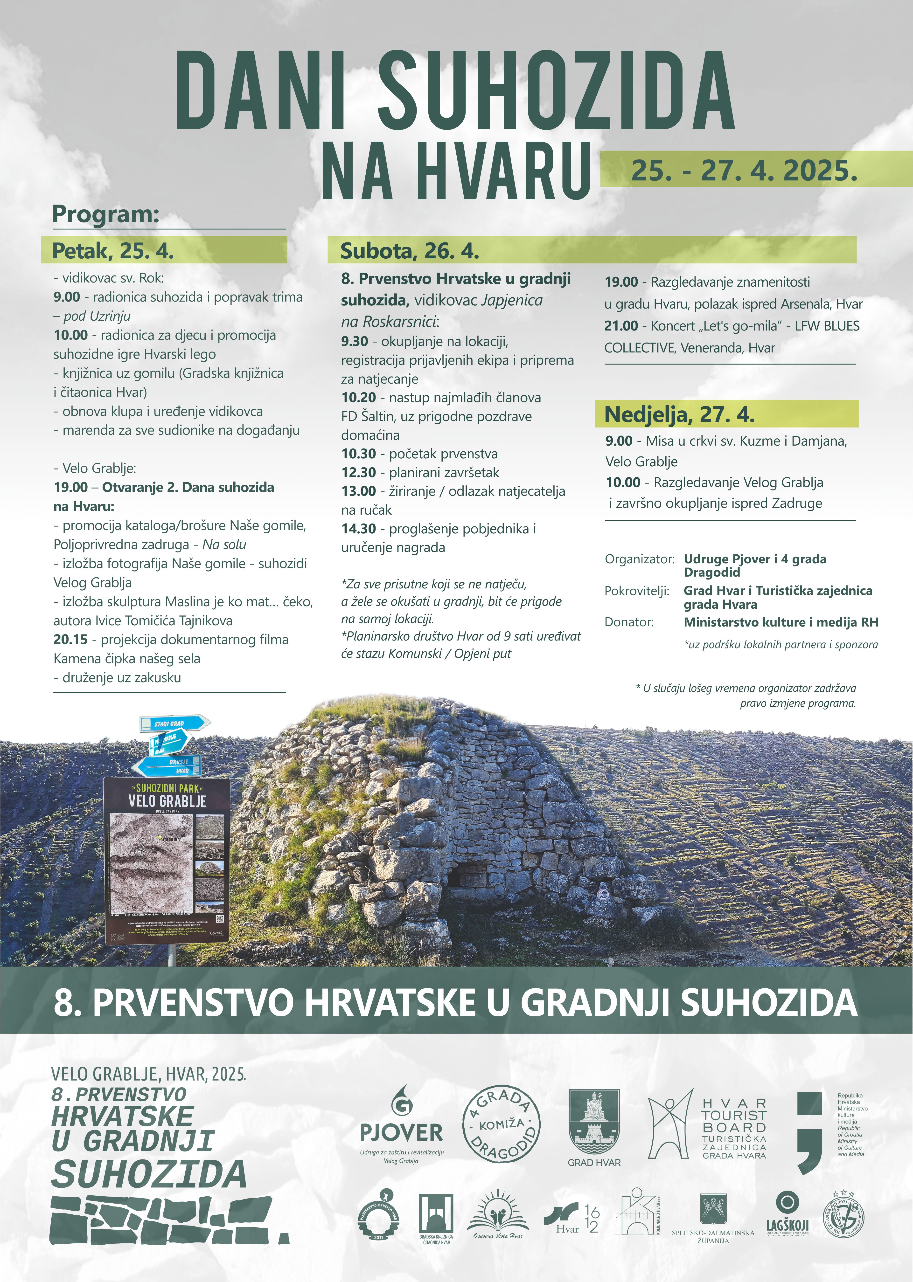 S ciljem promocije i revitalizacije suhozidne kulturne baštine te uključivanja lokalnih zajednica u njeno vrednovanje i očuvanje, od 25. do 27. travnja 2025. održat će se 2. Dani suhozida na Hvaru s 8. Prvenstvom Hrvatske u gradnji suhozida, u organizaciji udruge Pjover iz Velog Grablja i splitske udruge 4 grada Dragodid.