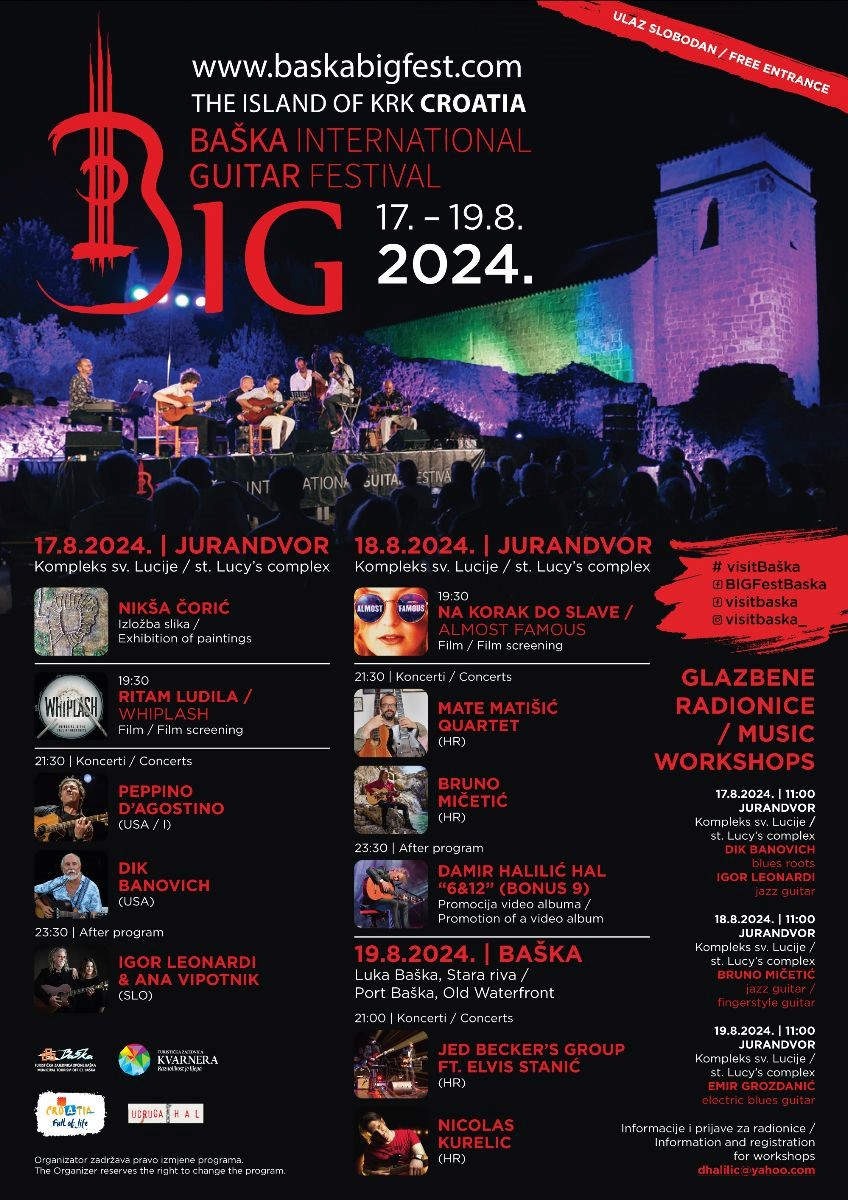 Uz zadivljujuću pozadinu Jurandvora i Baške, ovaj festival obećava nezaboravno iskustvo za sve glazbene entuzijaste, obožavatelje gitare, ali i slučajne posjetitelje. I najbolje od svega, ulaz je slobodan za sve! Pridružite nam se od 17. do 19. kolovoza i doživite magiju BIG-a!
