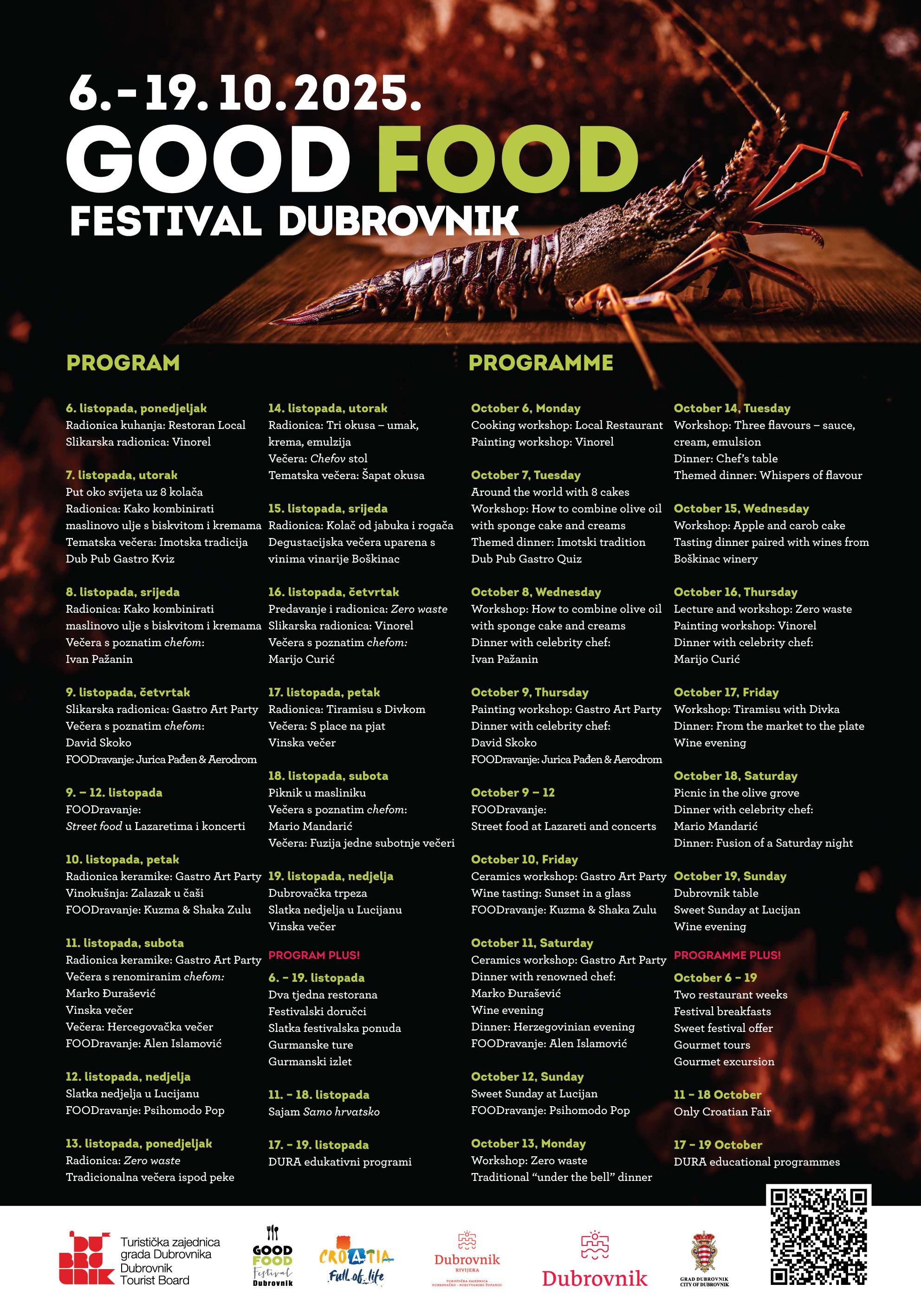 Tijekom cijelog razdoblja od 6. do 19. listopada više od šezdeset restorana u Dubrovniku, Župi dubrovačkoj, Cavtatu, Konavlima i Dubrovačkom primorju nudi posebne festivalske jelovnike, a svako jutro dostupni su festivalski doručci i dnevne slatke ponude. Cjelokupnu ponudu provjerite na idućoj poveznici http://bit.ly/4n5uXBb