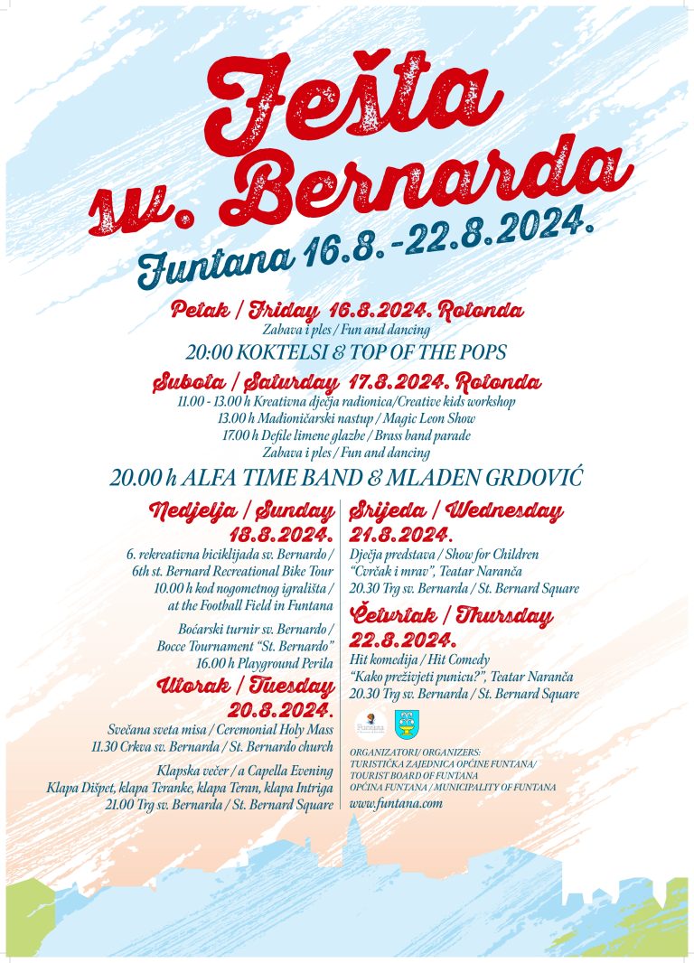 S velikim zadovoljstvom najavljujemo ovogodišnju Feštu sv. Bernarda u Funtani, koja će se održati od 16. do 22. kolovoza 2024. Ova manifestacija obećava nezaboravan tjedan prepun zabave, glazbe, sportskih aktivnosti i ukusne hrane, privlačeći mještane i posjetitelje svih uzrasta.