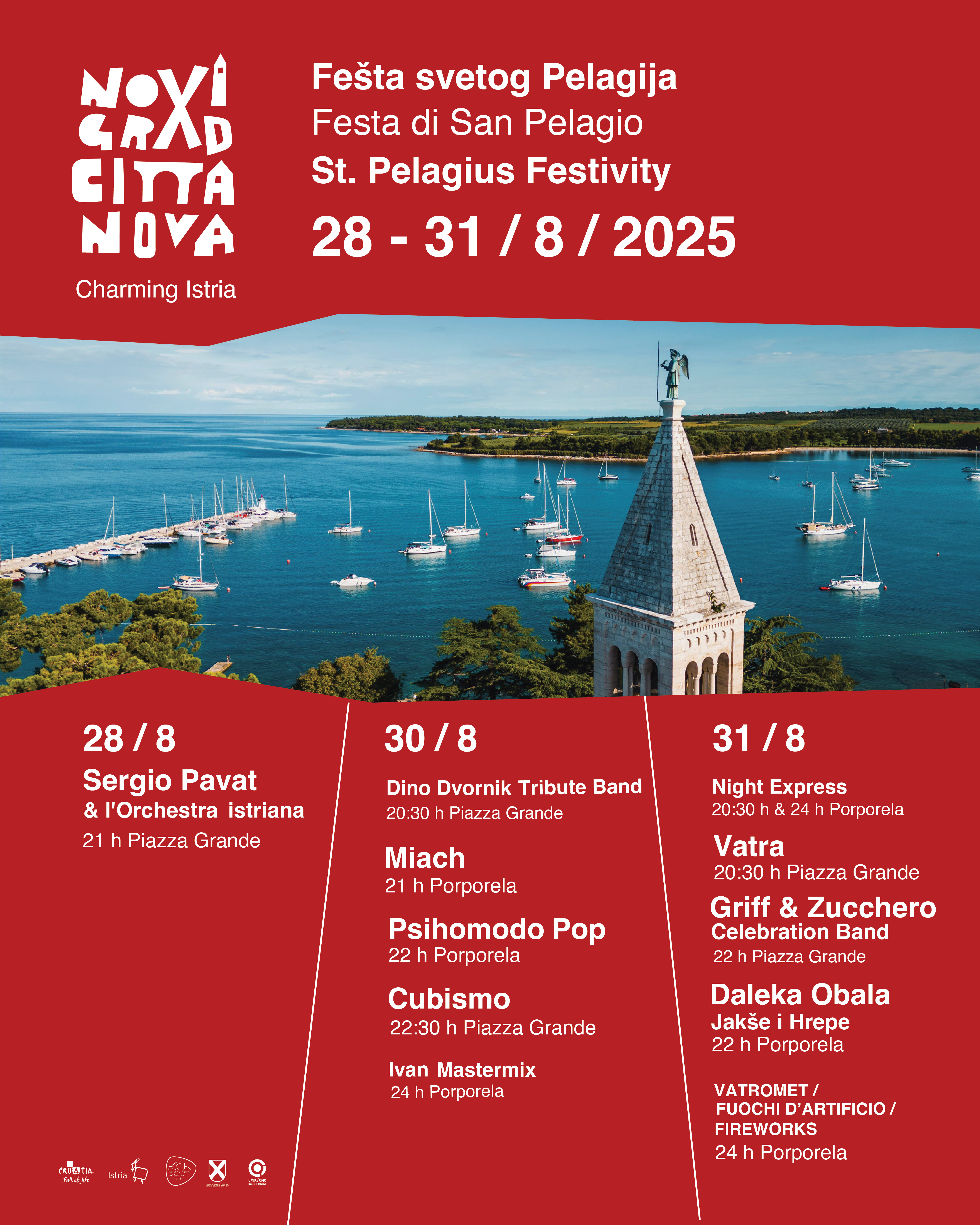 Na sam Dan Grada i gradskog sveca zaštitnika, 28. kolovoza, u prijepodnevnim satima održat će se svečana koncelebrirana Sveta misa i procesija s relikvijama svetog Pelagija, dok će se predvečer održati svečana sjednica Gradskog vijeća, na kojoj će se među ostalim uručiti gradska priznanja ovogodišnjim laureatima. U 21 sati na Velikom trgu će se održati koncert Sergia Pavata & l'Orchestra istriana.