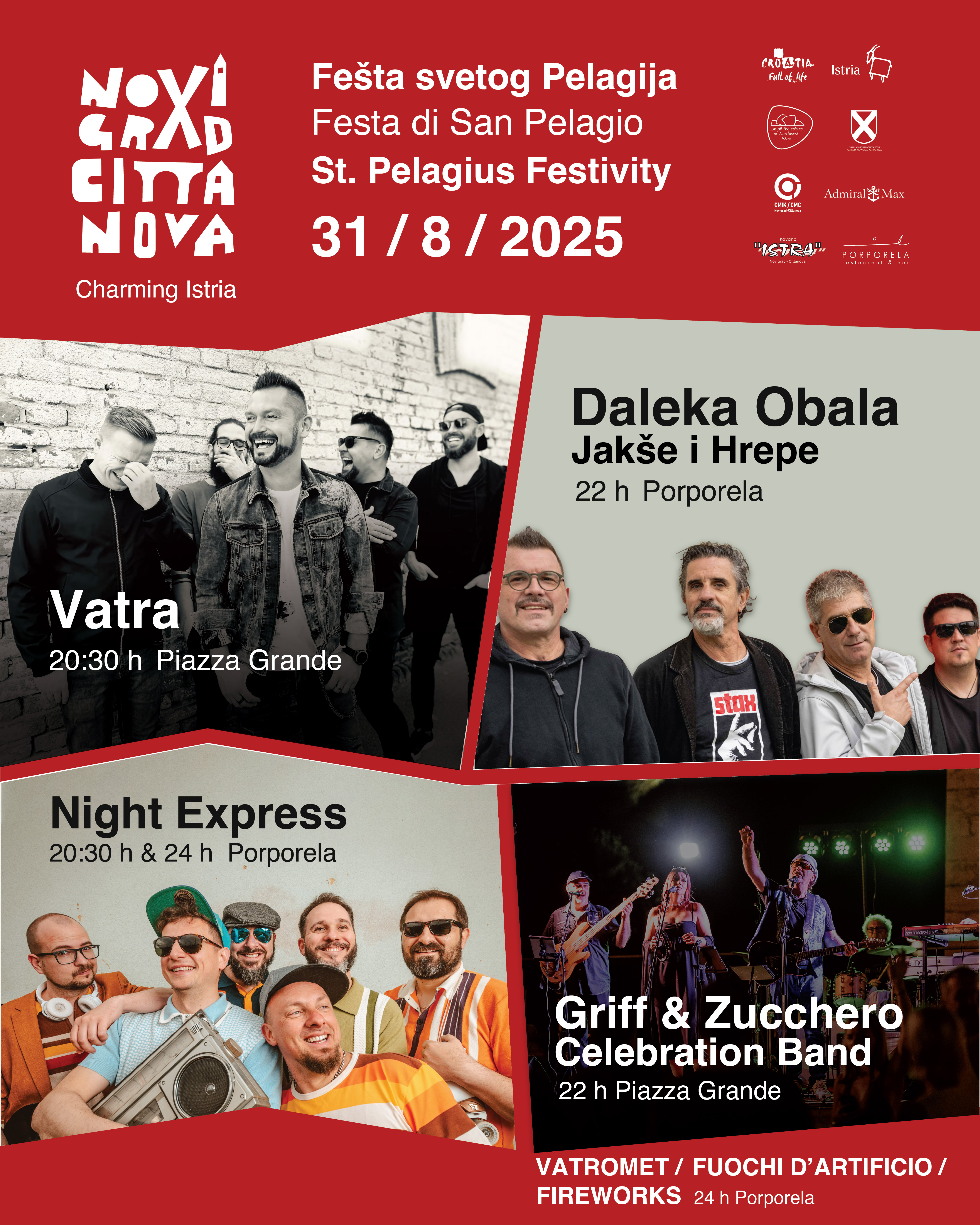 Duga noć bit će i u nedjelju, 31. kolovoza, a koncertni program počet će u 20:30 sati nastupom legendarne grupe Vatra na Velikom trgu, dok će u isto vrijeme na obali Porporela atmosferu zapaliti energični Night Express. Nakon koncerta Vatre, središnji novigradski trg će od 22 sata biti u znaku najljepših pjesama Zucchera u izvedbi Goran Griff & Zucchero Celebration Band. Od 22 sata Daleka Obala Jakše i Hrepe će zapaliti Porporelu emocijama i energijom jer njihove pjesme nisu samo hitovi, nego i uspomene koje svi nosimo. S njima ćemo dočekati spektakularni vatromet u ponoć, nakon čega će Night Express će ponovo preuzeti mikrofon. Svjetski hitovi i neopisiva energija zabave održat će feštu užarenom još koji sat.