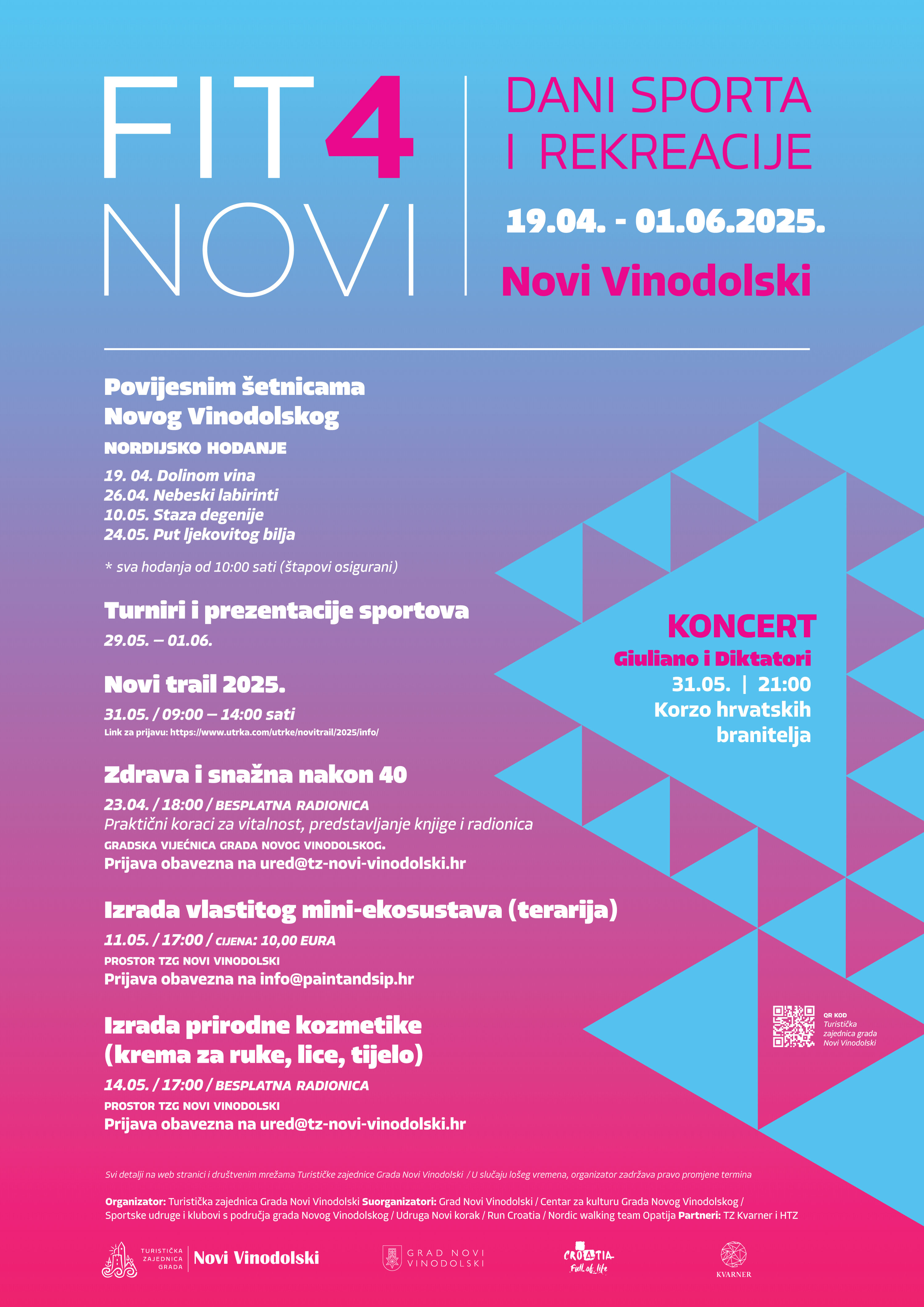 Ovog proljeća Novi Vinodolski postaje središte rekreacije, zdravlja i dobre zabave, jer stiže novo izdanje omiljene manifestacije FIT4NOVI! Od travnja do lipnja očekuje vas bogat program ispunjen nordijskim hodanjem, edukativnim radionicama, sportskim turnirima i nezaboravnim glazbenim trenutcima.
