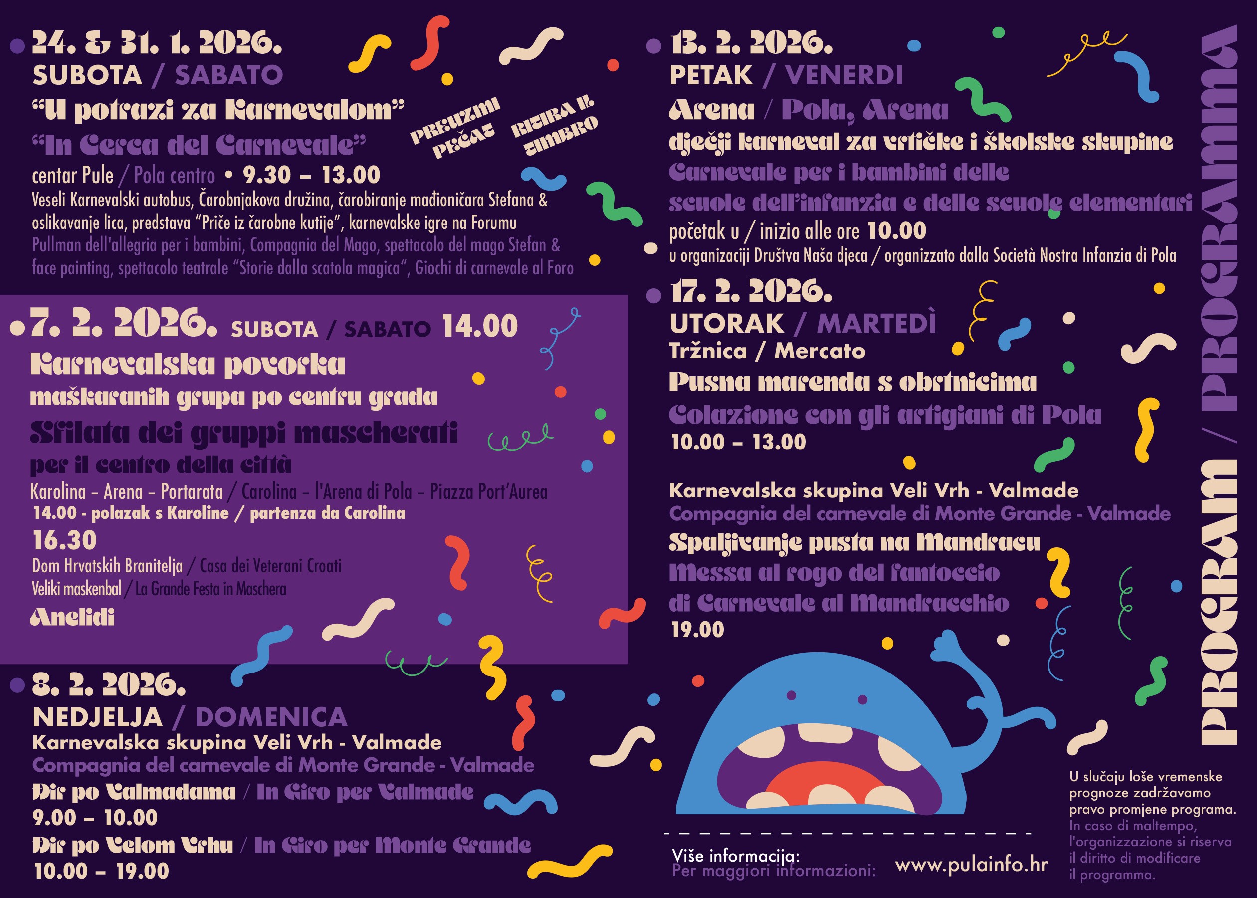 Manifestacija Pulski karneval započinje programom za najmlađe pod nazivom „Potraga za karnevalom“, koji će se održavati subotom 24. i 31. siječnja 2026. godine