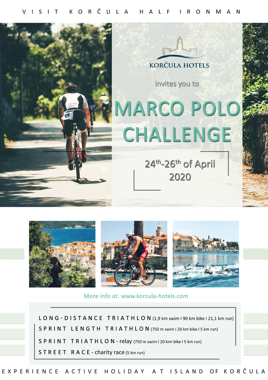 Jedan od najvažnijih događaja predsezone je korčulanski K3 triatlon Izazov Marka Pola, koji se organizira desetu godinu zaredom. Ova utrka okuplja nekoliko stotina sudionika iz cijelog svijeta, koji će se po prvi put 24. travnja, imati prilike okušati u half Ironmanu. Radi se o jednoj od najpopularnijih triatlonskih disciplina koja se sastoji od 1.9 kilometara plivanja, 90 kilometara vožnje biciklom i 21 kilometar trčanja.Svi zainteresirani mogu se prijaviti izravno na www.marcopolochallenge.com ili putem web stranice Korčula Hotela www.korcula-hotels.com.