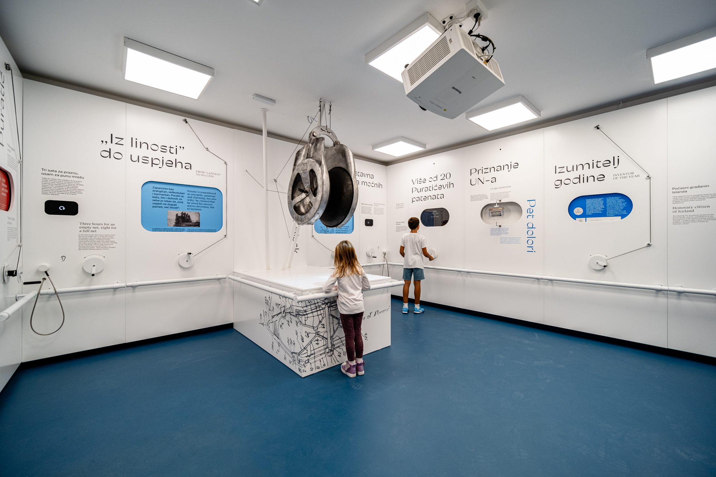 Upravo iz filozofije Maria Puratića proizašla je ideja da posjetitelj okretanjem koloturnika otkriva sadržaj koji se prezentira spuštanjem i dizanjem ploča unutar zidnih obloga. Otvori koji otkrivaju sadržaj proizlaze iz stiliziranih formi brodskih prozora.