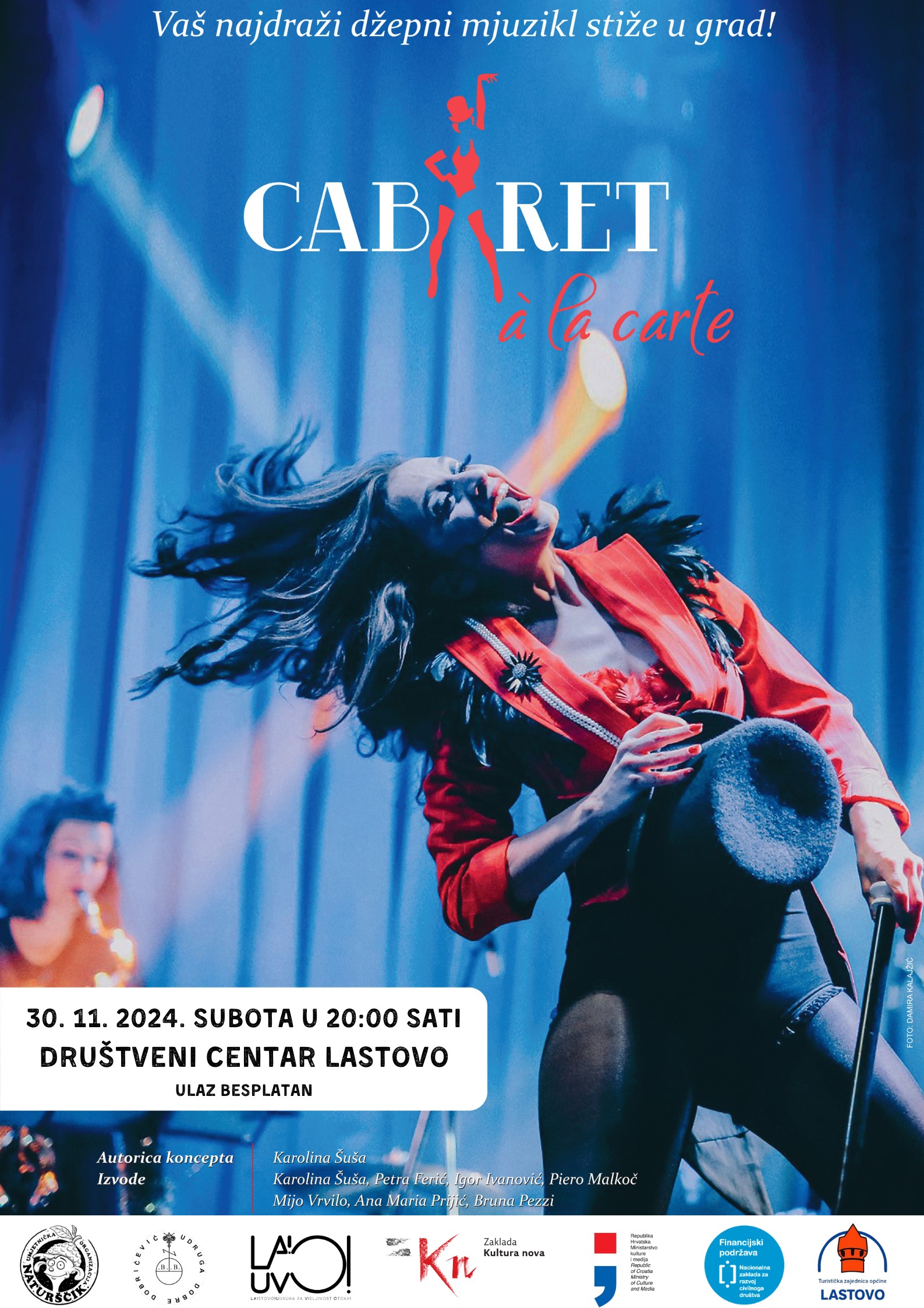 Kate koju znate je Karolina Šuša koja se sa svojim stvarno sjajnim živim bendom i plesačicama nakon uspješnog nastupa u Bašti na Lastovu prije nešto manje od tri godine vraća sa svojim Cabaretom á la carte u obližnji Društveni centar ove subote 30. studenog u 20:00 h u organizaciji Umjetničke organizacije Naturščik i Udruge Dobre Dobričević. Proljetos je na lastovskoj rezidenciji pripremila nove tekstove i glazbu za premijerno izvedbu na Lastovu, a prošli su tjedan lokalna djeca naučila Katinu pjesmu i koreografiju, a bojanku ponijeli kući za uspomenu.