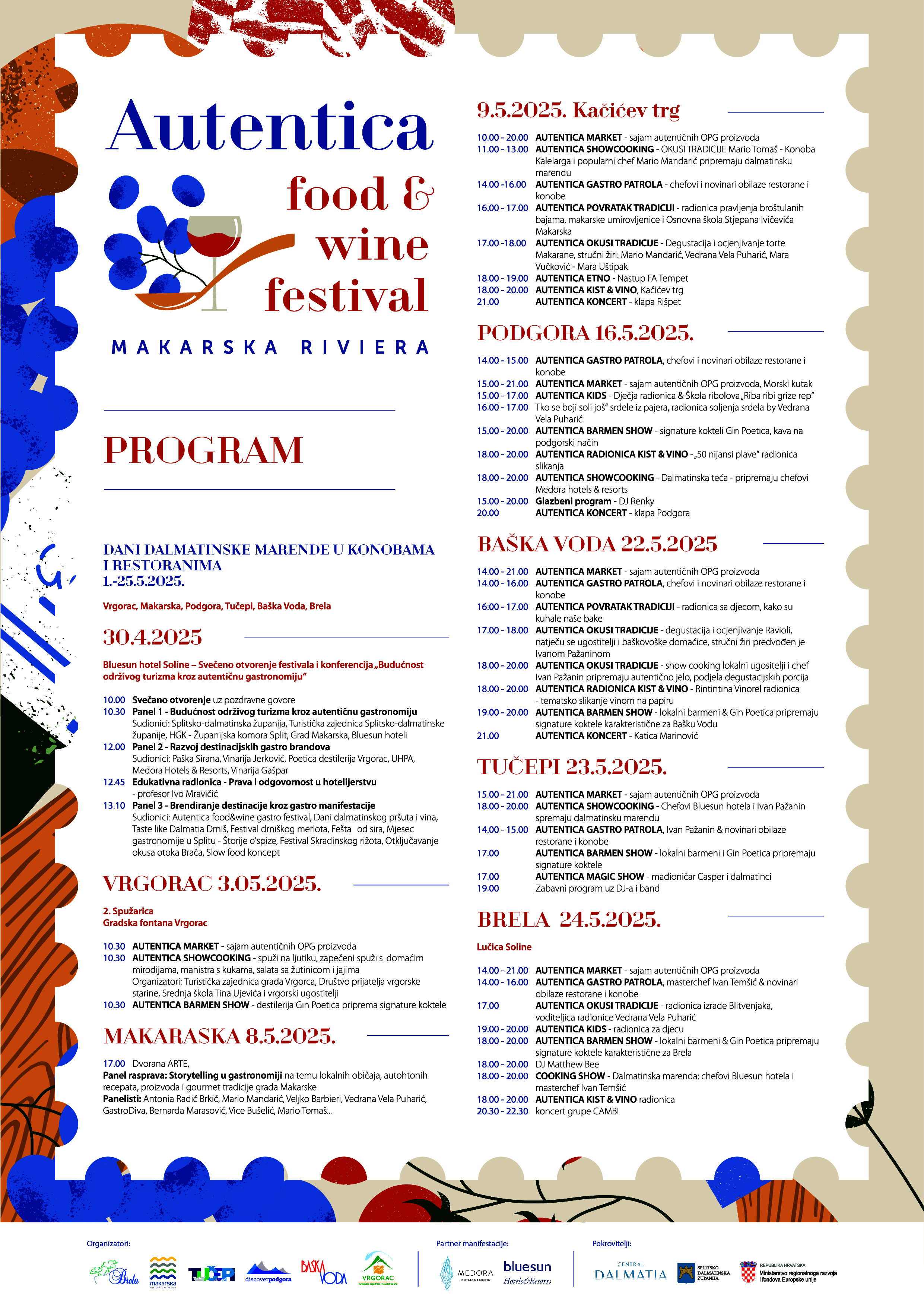Na krilatici da se autentičnost nekog kraja najbolje može upoznati kroz mirise i okuse tradicije, turističke zajednice Brela, Baška Voda, Makarska, Tučepi, Podgora i Vrgorac i ovog svibnja, pod pokroviteljstvom Ministarstva regionalnoga razvoja i fondova Europske unije te uz partnerstvo Splitsko-dalmatinske županije, TZ Splitsko-dalmatinske županije, hotelskih kuća Bluesun i Medora, od 30. travnja do 24. svibnja, organiziraju Autentica Food&Wine festival.