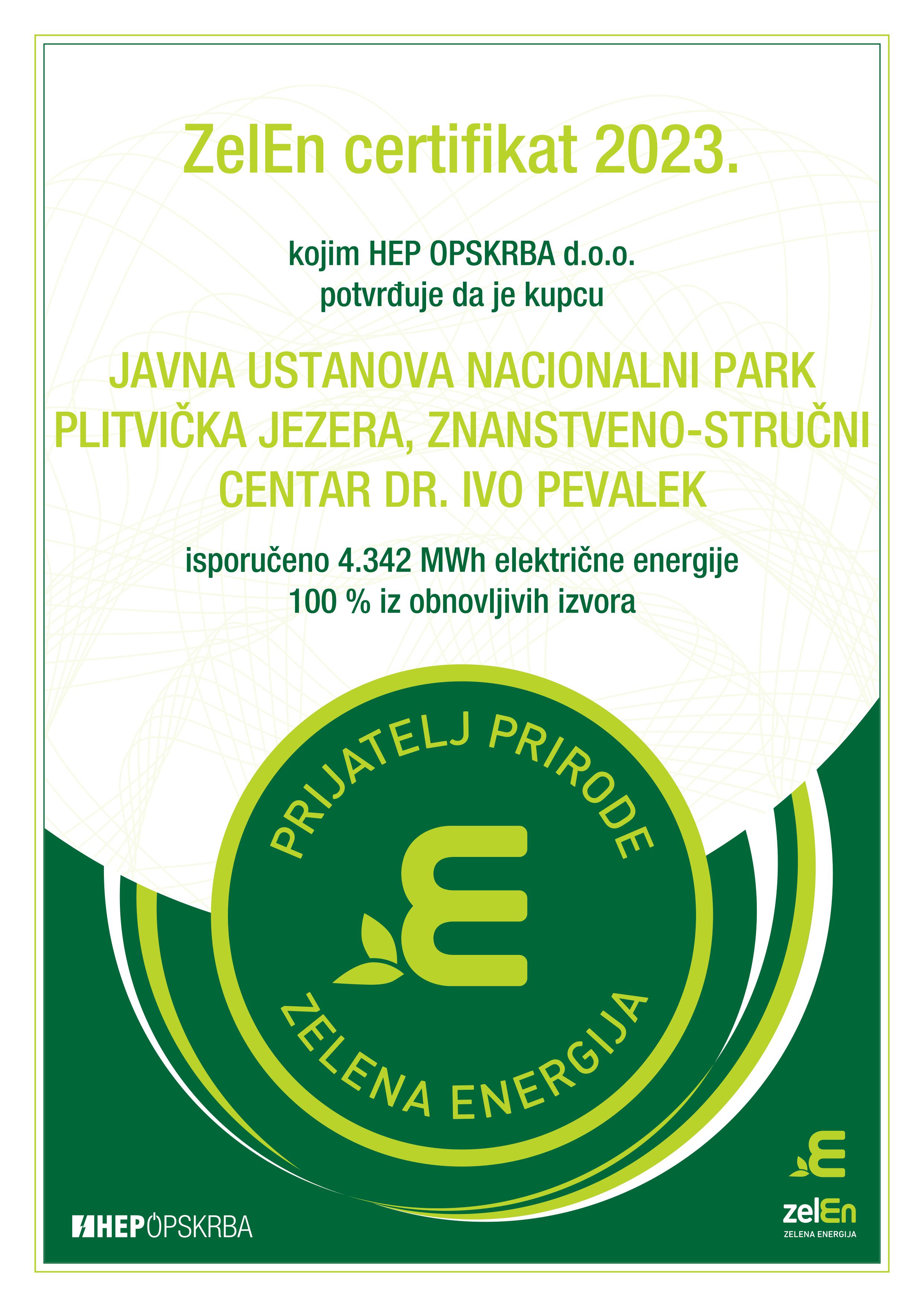-Od 2018. godine posjedujemo ZelEn certifikat koji potvrđuje da je 100% električne energije koja se koristi u Parku dobivena iz obnovljivih izvora. Ovaj se certifikat obnavlja svake godine i dokaz je da Park nabavlja električnu energiju iz certificiranih elektrana namijenjenih poslovanju sa sigurnim utjecajem na okoliš.