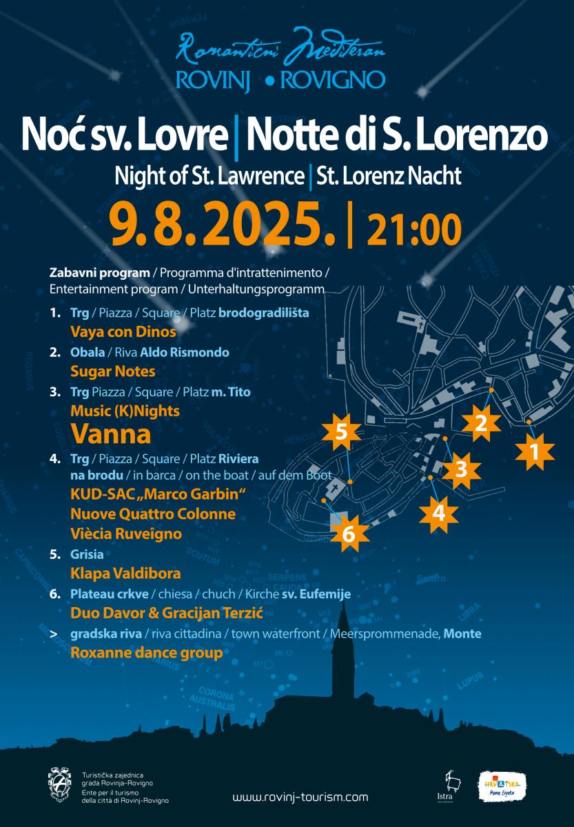 Turistička zajednica grada Rovinja-Rovigno će u subotu 9. kolovoza, organizirati sedamnaestu ediciju manifestacije pod nazivom Noć sv. Lovre. Kako bi se tijekom večeri naglasio romantični ugođaj u gradu, na rivi će gradska rasvjeta biti ugašena i za tu prigodu osvijetljena bakljama, dok će brojne terase ugostitelja biti osvijetljene svijećama. Djelatnici Turističke zajednice će tim povodom ugostiteljskim objektima duž gradske rive uručiti 1600 ukrasnih svijeća, kako bi ugostitelji kreiranjem prigodne atmosfere upotpunili doživljaj noći pod zvijezdama.