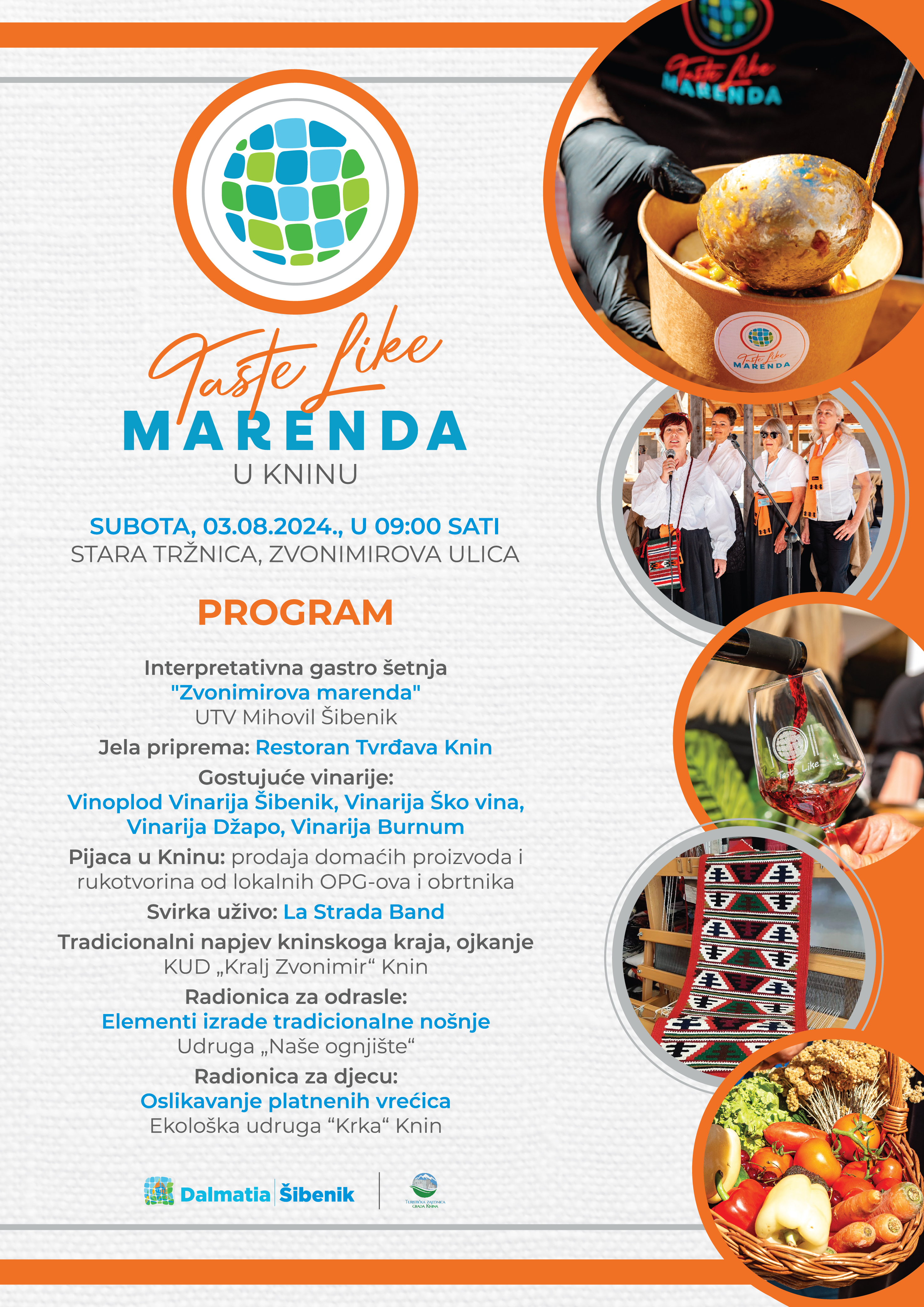 Na staroj tržnici, u Zvonimirovoj ulici u Kninu vas iduću subotu, 3. kolovoza s početkom u 9 sati očekuje četvrta marenda u sklopu projekta „Taste like... marenda“ koju organizira TZ Šibensko-kninske županije, u suradnji s TZ Grada Knina. Tradicionalne marende će pripremati kuhari Restorana Tvrđava Knin, a uz njih ćete moći uživati u vinima Vinoplod Vinarije Šibenik, Ško vina, Vinarije Džapo te Vinarije Burnum. Uz to vas očekuje i zanimljiva interpretativna gastro šetnja, glazba uživo, ojkanje, radionica za djecu i odrasle te domaći proizvodi od lokalnih OPG-ova.