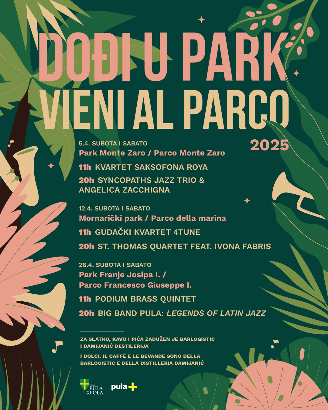 Ovog travnja, pulski parkovi postaju kulisa za jedinstvenu glazbenu manifestaciju "Dođi u park", koja spaja prirodu, vrhunsku glazbu i nezaboravne trenutke druženja. Na tri lokacije – Monte Zaro, Mornarički park i Park Franje Josipa I. – ljubitelji glazbe moći će uživati u nastupima vrhunskih umjetnika, od gudačkih kvarteta do energičnog jazza.