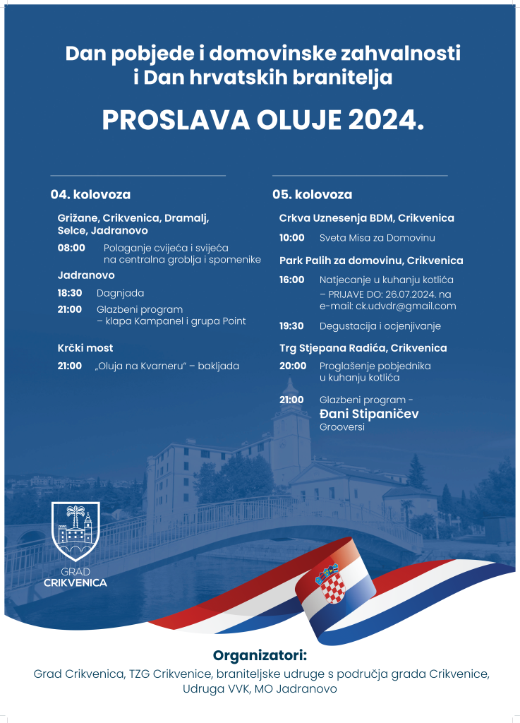 Grad Crikvenica dvodnevnim će programom proslaviti Dan pobjede i domovinske zahvalnosti i Dan hrvatskih branitelja. Program će se održati 4. i 5. kolovoza 2024. godine.