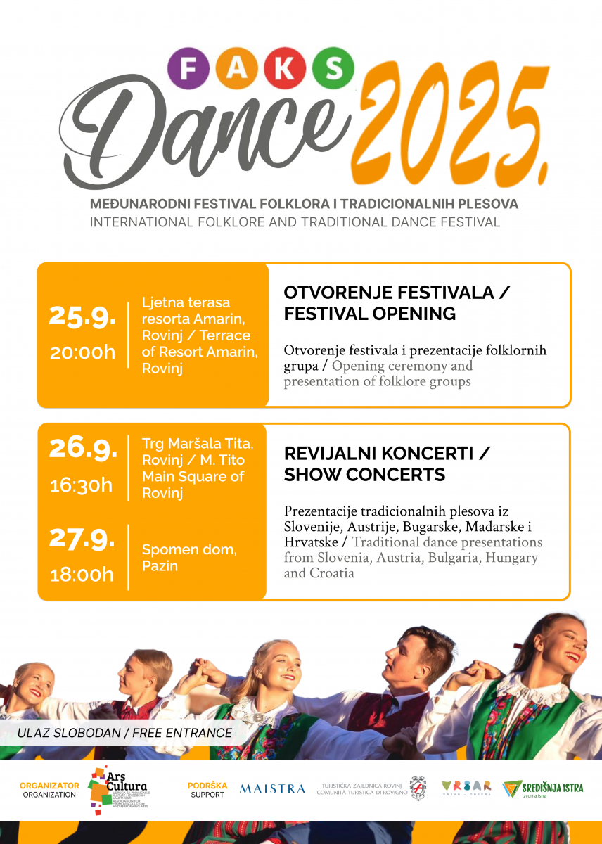 Zadovoljstvo nam je pozvati u Rovinj na FAKS Dance - Međunarodnog festivala folklora i tradicijskih plesova od 25.-28.09.2025.