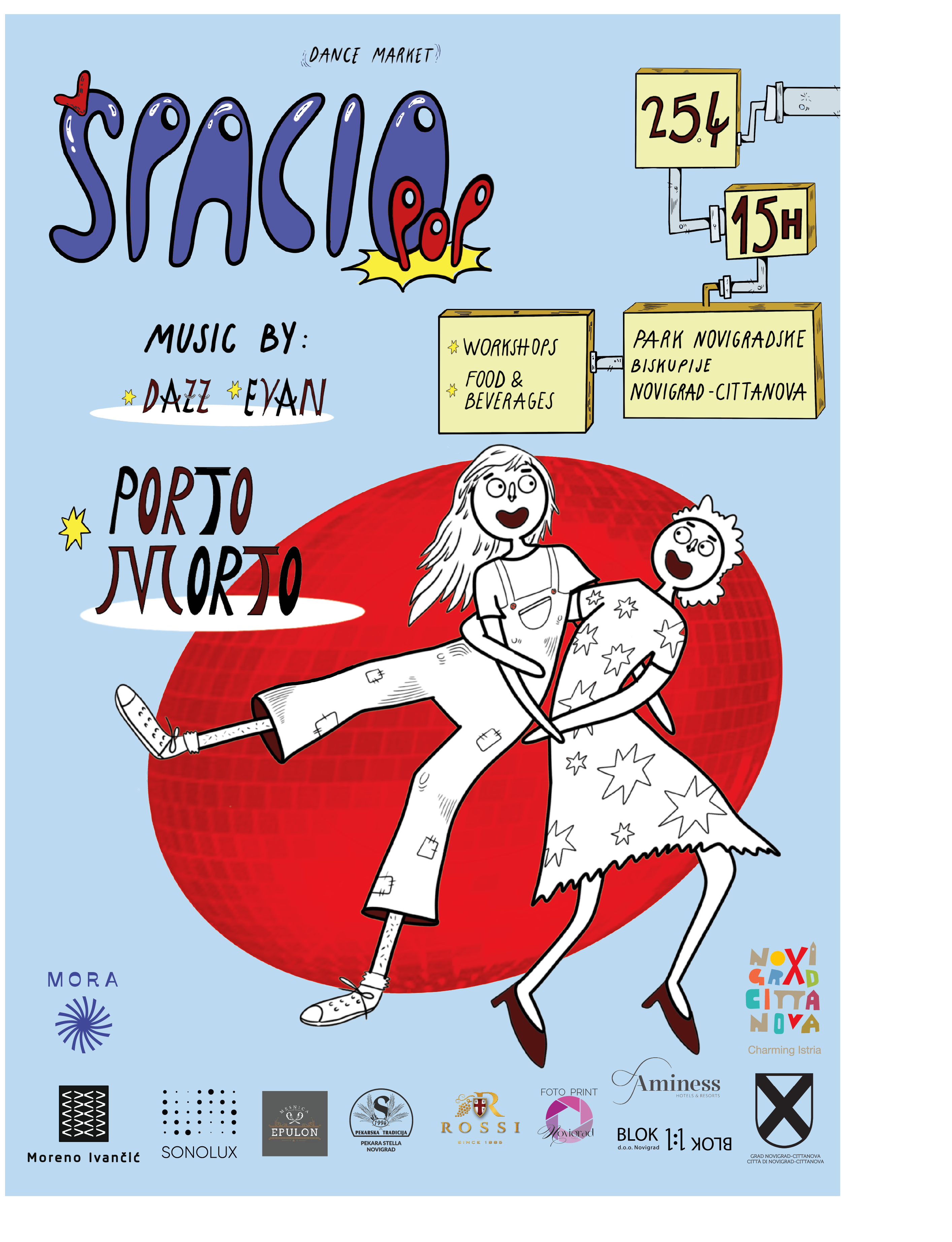 Špacio Pop {dance market} projekt je Udruge MORA koji spaja glazbu, lokalnu kreativnost, gastro ponudu i radioničarski program u jedinstven proljetni doživljaj. Događanje se održava u srcu Novigrada, u Parku Novigradske biskupije, i otvoreno je za sve generacije i profile posjetitelja. Događanje podržavaju: Grad Novigrad - Cittanova, Turistička zajednica Novigrad Cittanova, Aminess, Moreno Ivančić Winery, Majc, Foto Print Novigrad, Rekviziteri, Blok 1:1, Sonolux d.o.o., Toons&Tunes i mnogi drugi bez kojih ovo događanje ne bi bilo moguće.