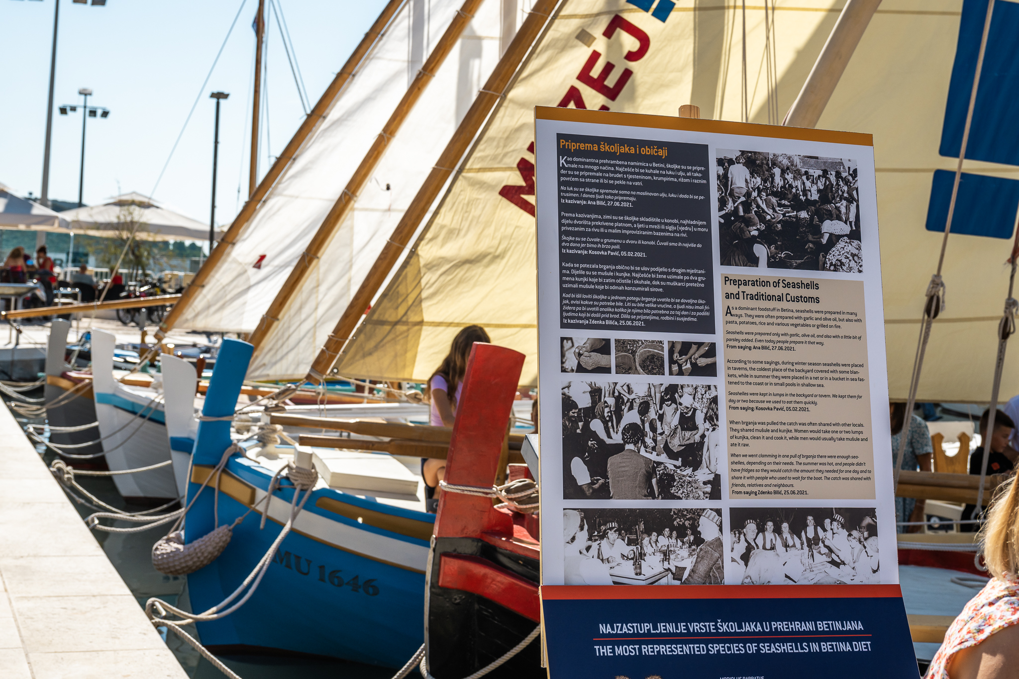 Na Trgu na moru, tik uz more, na štafelajima je bila postavljena i zanimljiva izložba „Kako su jeli naši stari?“, koja se savšeno uklopila u cjelokupan ambijent, a dodatno su je obogatile zanimljive radionice za djecu i odrasle u izvedbi Muzeja betinske drvene brodogradnje, na kojoj su sudionici naučili kako se rade mornarski čvorovi.