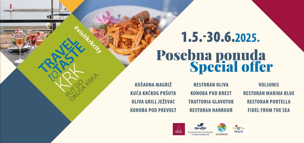Tijekom proljetnih i ljetnih mjeseci, od 1. svibnja sve do kraja lipnja, u dvanaest ugostiteljskih objekata grada Krka imat ćete priliku uživati u posebno kreiranim jelovnicima koji povezuju tradiciju s modernim pristupima kuhinji. Svako jelo nastalo je od pomno biranih lokalnih sastojaka, od janjetine, domaćih sireva i pršuta, do svježih plodova mora i otočnih biljaka.