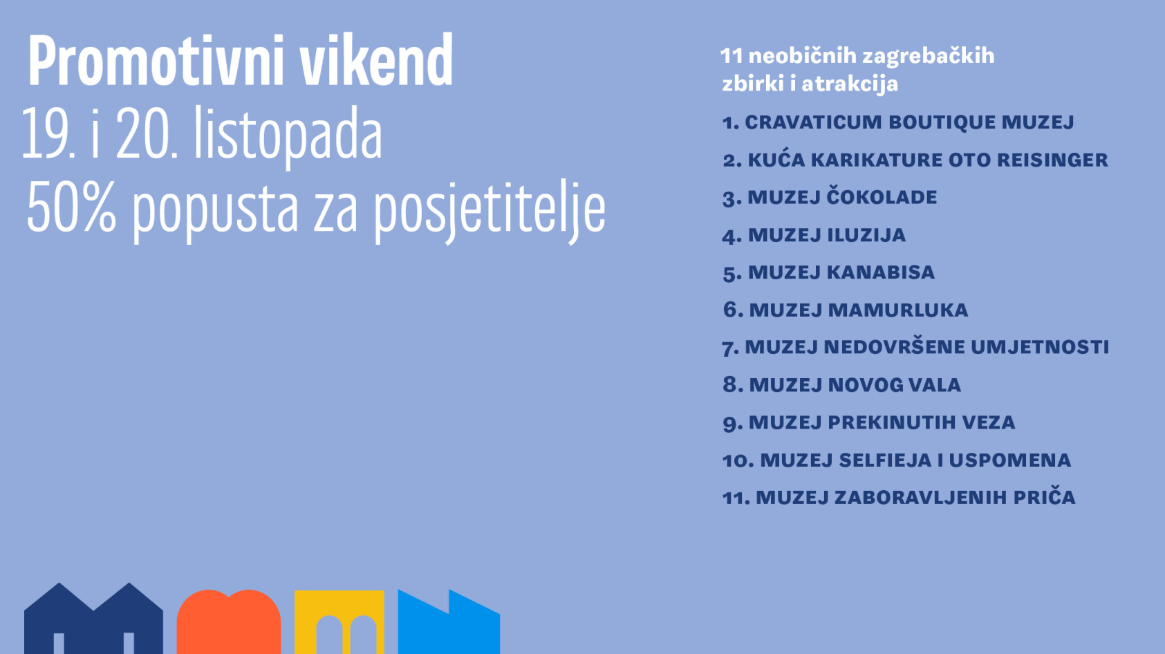 Turistička zajednica grada Zagreba (TZGZ) pokrenula je novu promotivnu kampanju i platformu pod nazivom „Museums, maybe“, koja okuplja niz neobičnih zagrebačkih zbirki i atrakcija. Ova inicijativa obuhvaća posebnu web stranicu, promotivni film i prigodnu akciju za nadolazeći vikend, 19. i 20. listopada. Tako će, u subotu i nedjelju posjetitelji imati priliku posjetiti čak 11 jedinstvenih zagrebačkih lokacija uz 50% popusta. U promotivnoj akciji sudjeluju Cravaticum boutique muzej, Kuća karikature Otto Reisinger, Muzej čokolade, Muzej iluzija, Muzej kanabisa, Muzej mamurluka, Muzej nedovršene umjetnosti, Muzej novog vala, Muzej prekinutih veza, Muzej selfieja i uspomena te Muzej zaboravljenih priča.
