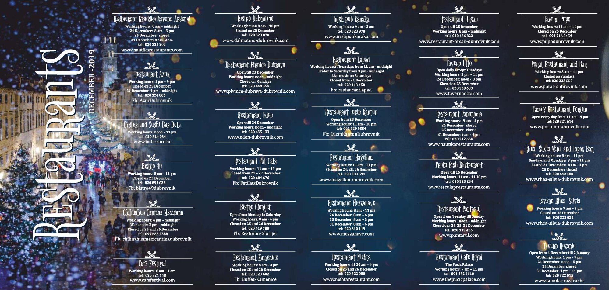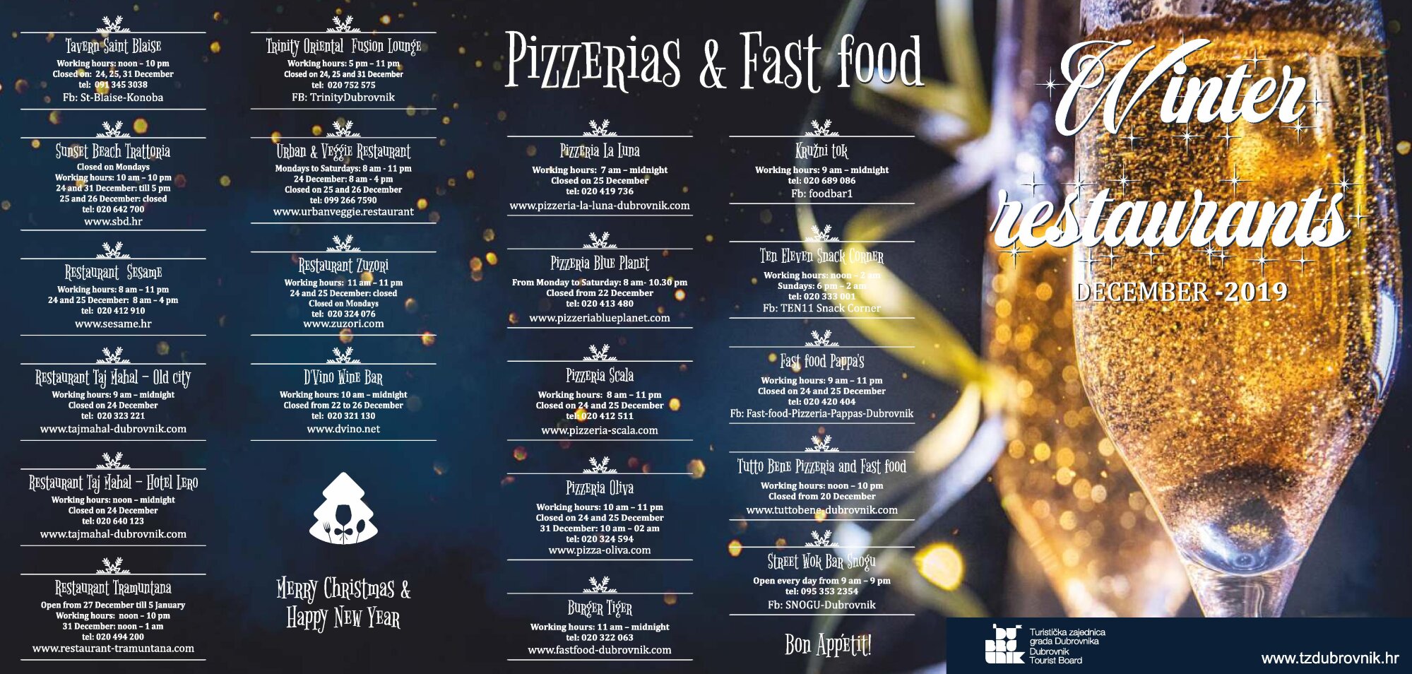 Turistička zajednica grada Dubrovnika je tiskala mjesečni letak za prosinac, koji sadrži popis otvorenih restorana, pizzeria te fast food-ova tijekom mjeseca prosinca uz posebno istaknuta radna vremena, kako bi gosti koji borave u Dubrovniku bili što bolje informirani te kako bi se otvoreni restorani što bolje promovirali.