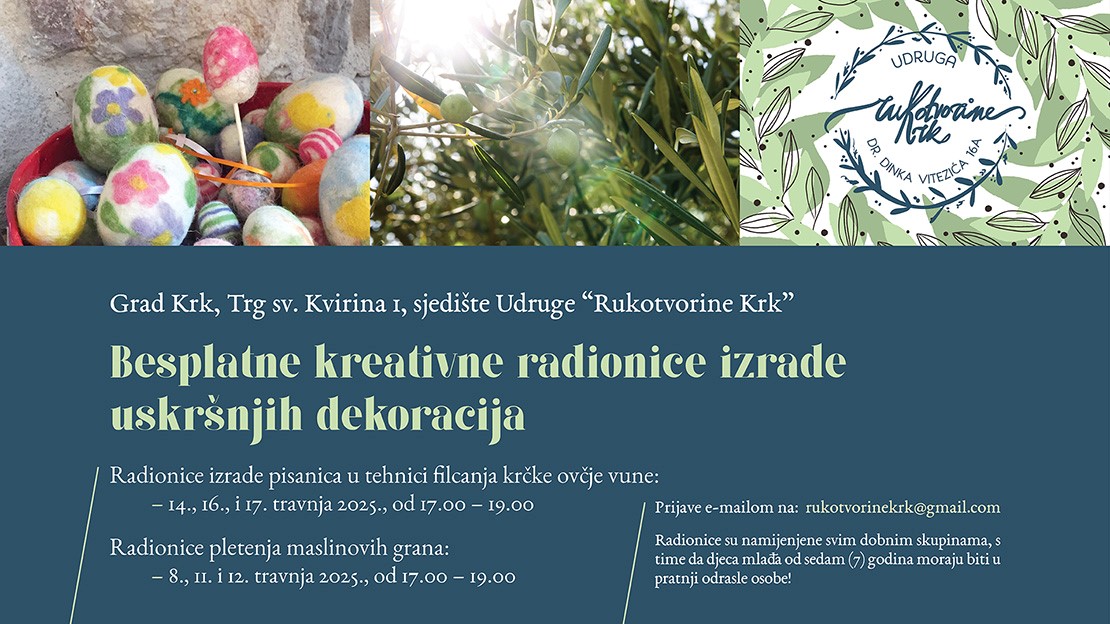 U duhu blagdana, Udruga Rukotvorine Krk organizira čak šest besplatnih radionica koje povezuju kreativnost i tradiciju. Tijekom travnja, u prostoru Udruge na Trgu sv. Kvirina 1, svi zainteresirani mogu sudjelovati u izradi pisanica tehnikom filcanja krčke ovčje vune te u učenju tradicionalnog pletenja maslinovih grana. Radionice su otvorene za sve uzraste, a posebno su prilagođene onima koji žele vlastitim rukama stvoriti nešto posebno. Djeca mlađa od sedam godina mogu sudjelovati uz pratnju odrasle osobe.