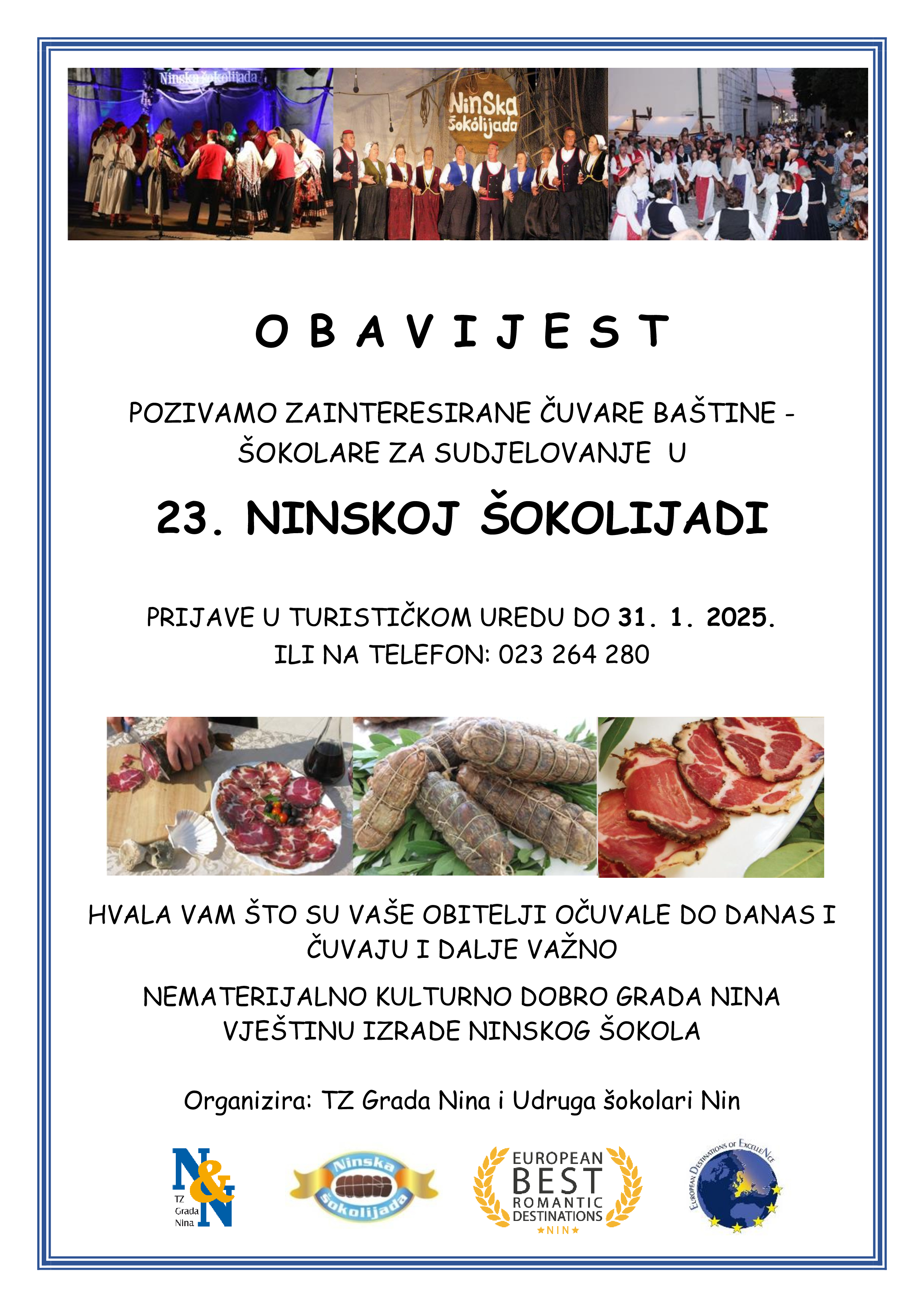 Pozivaju se na sudjelovanje čuvari baštine -proizvođači autohtonog proizvoda ninskog kraja. Turistička zajednica Grada Nina i Udruga šokolara Nin upućuju poziv zainteresiranim natjecateljima da se prijave u izboru za naj šokol i u ovoj godini.