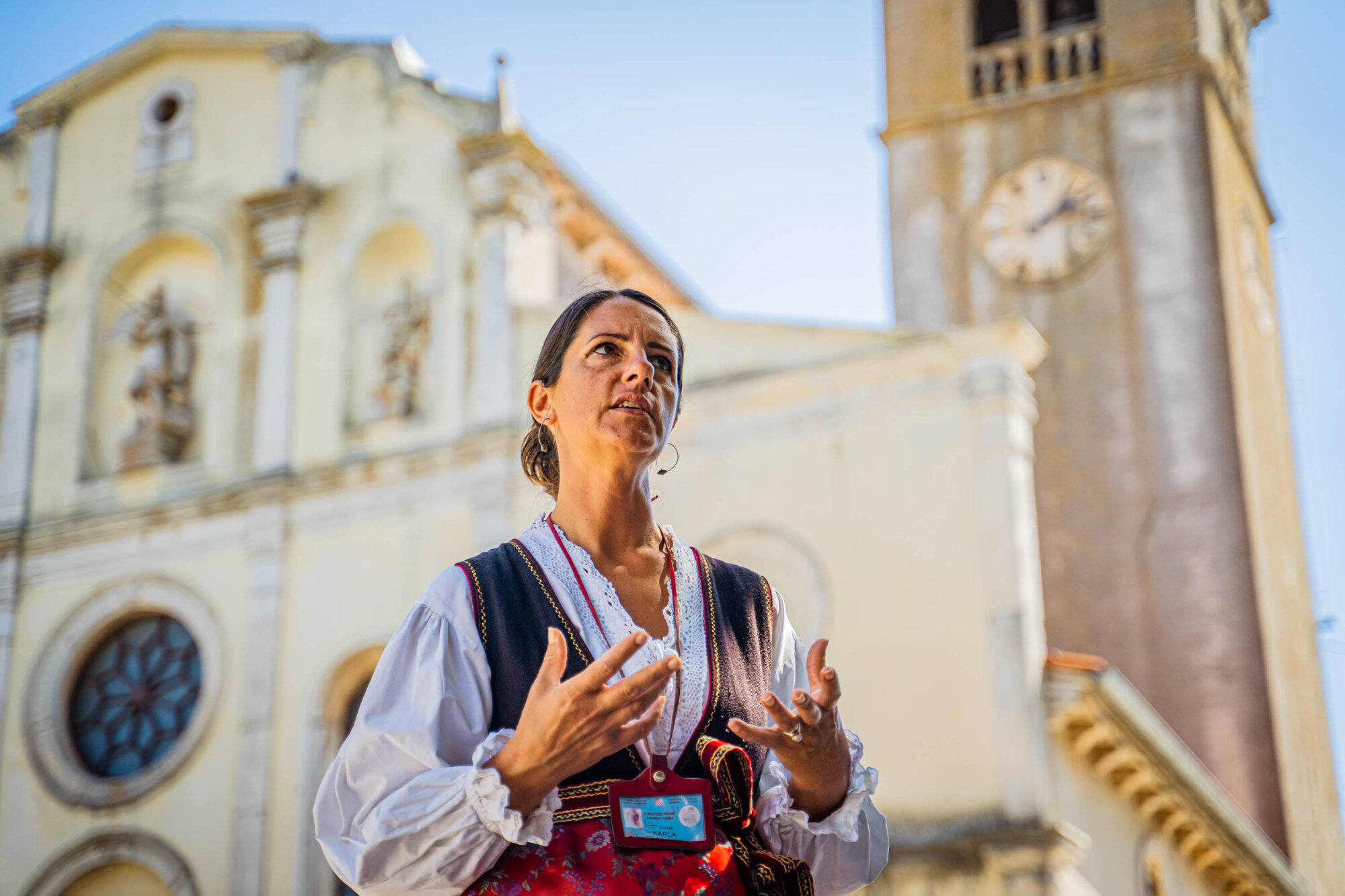 Ona u maniri profesionalnog story tellera gostima kroz laganu jednosatnu šetnju nadahnuto pripovijeda „štuoriju” o Žminju, o njegovoj povijesti i razvoju kao naselja, o njegovim stanovnicima te njihovim običajima i jeziku, o sakralnoj i svjetovnoj graditeljskoj baštini, o tome kako su živjeli i radili, kako se zabavljali, što su jeli, i kako žminjski gosti sve to mogu pronaći i doživjeti u današnjici. Ovisno o sastavu grupe, pripovijedanje se odvija na hrvatskom jeziku s vješto ubačenim sekvencama na izvornome žminjskom govoru, ili pak na izvrsnom engleskom, a za završetak ture gosti sudjeluju i u simpatičnoj nagradnoj igri kroz koju nauče nekoliko žminjskih riječi i fraza, naravno uz informaciju da je žminjski govor uvršten u UNESCO-v popis zaštićene nematerijalne kulturne baštine.