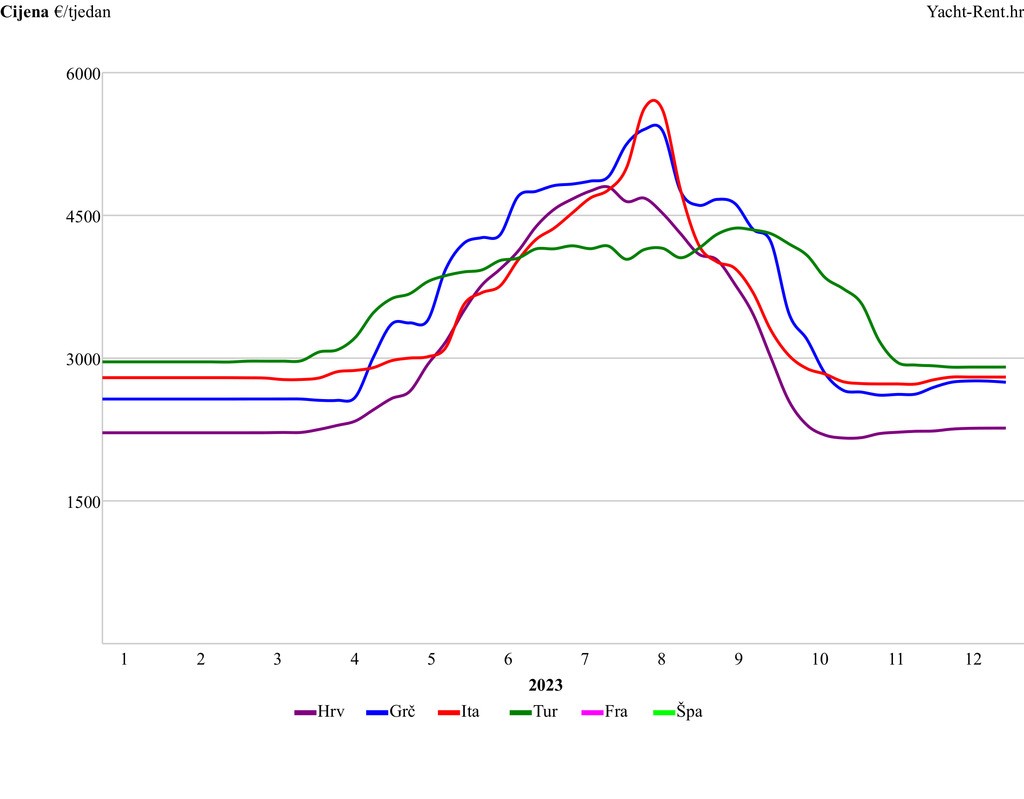 Prosječna cijena najma jedrilica u Hrvatskoj iznosi 2,972€ što je znatno niže nego kad u prosjek ulaze i motorne jahte. Kretanje cijena iznajmljivanja jedrilica tijekom sezone vidi se na grafu G2 ispod. Najviša prosječna cijena najma javlja se u tjednu od 22.07., a izvan sezone pada i za 55%