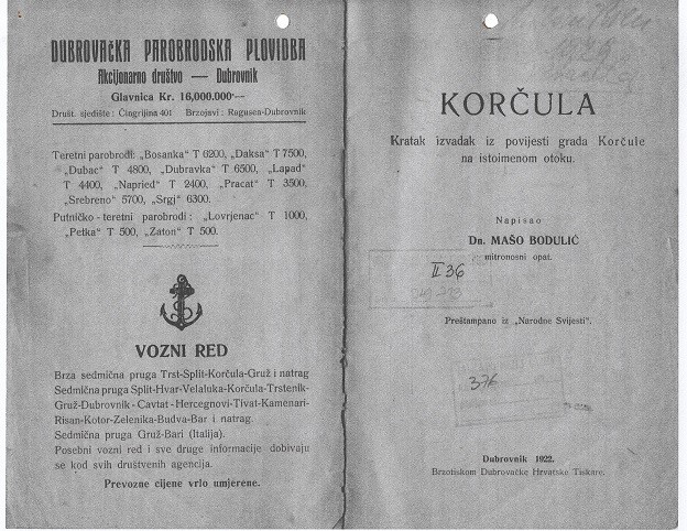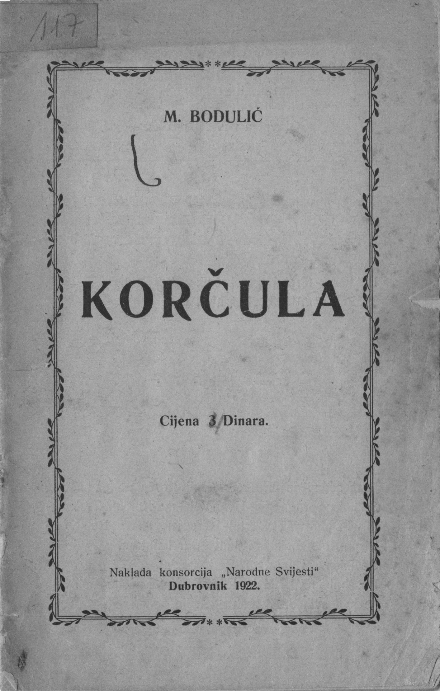 U godinama neposredno nakon Prvog svjetskog rata u Korčuli nije bilo turizma (1919-1921 otok Korčula je bio pod Talijanskom okupacijom), no izgleda da je u godini 1922 ipak bilo nešto posjetitelja – turista, jer se je Korčulanski opat, Don Mašo Bodulić, našao ponukan tiskati svojevrstan vodič za strane posjetitelje.
