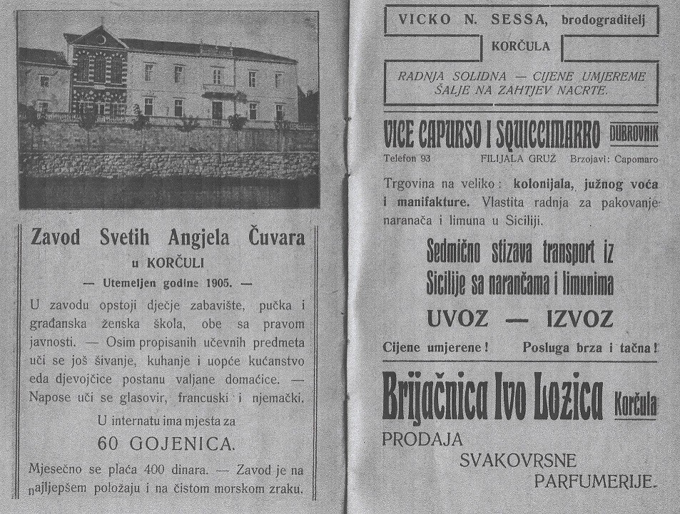 Nakon ovih opisa slijedi sedam stranica oglasa (tada bi se reklo: reklama) korčulanskih i dubrovačkih zanatlija, trgovaca, ugostitelja, bankara i brodovlasnika, a svoju „reklamu“ s fotografijom je objavio i samostan časnih sestara Dominikanki u Korčuli „Zavod Svetih Angjela Čuvara“.