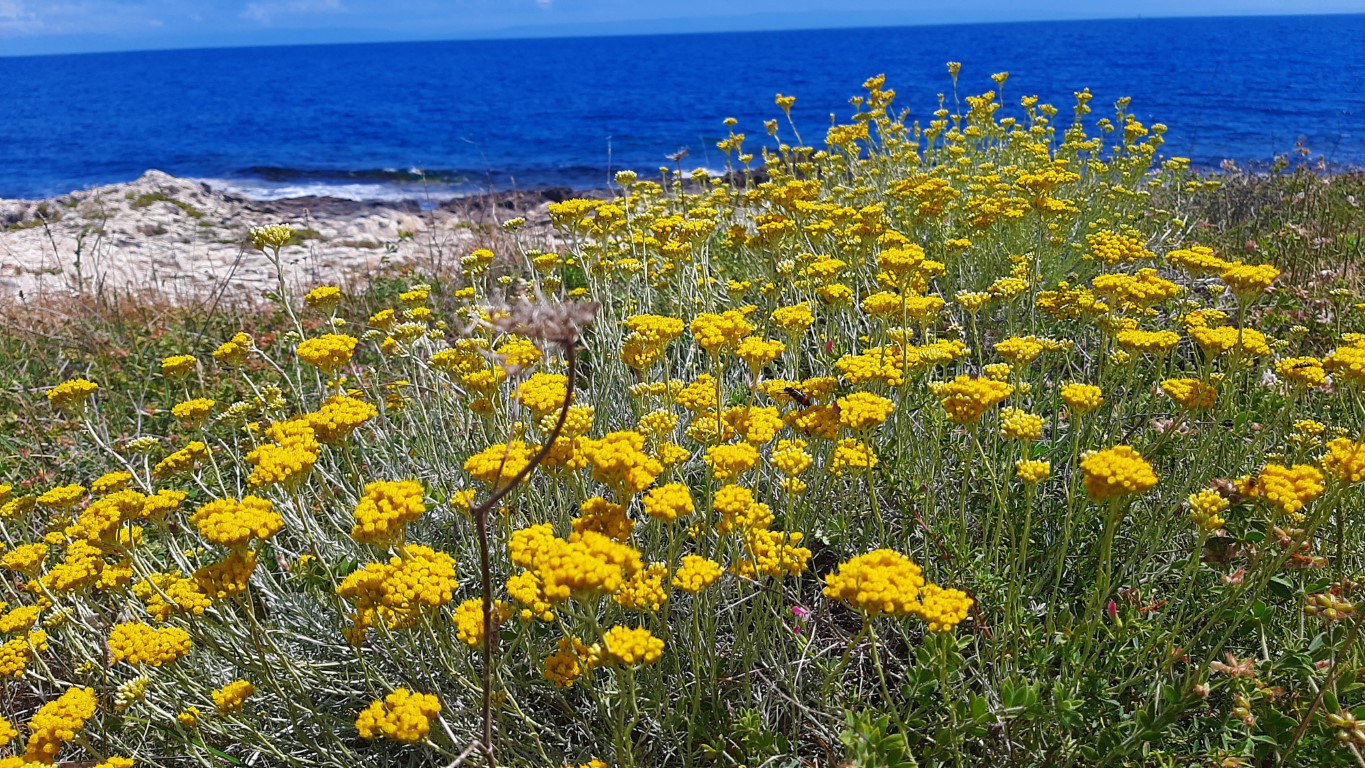 Na travnjacima prevladavaju vrste iz porodice trava (Poaceae), ali i zaštićene vrste orhideja. Ispaša stoke ili košnja čuva ih od zaraštavanja i omogućava nesmetani razvoj i očuvanje mnogih strogo zaštićenih vrsta. Kamenjarski pašnjaci stanište su ljekovitog i aromatičnog primorskog smilja (Helichrysum italicum (Roth) G. Don fil.) koji voli otvorena suha i osunčana mjesta u blizini obale mora na što ukazuje i latinski naziv roda –Helichrysum (grč. helios-sunce, chryson-zlatan). Da je stvarno tako, uvjerite se i sami od travnja do srpnja, kada se njegove male, cvjetne žute glavice razmeću ljepotom u punoj raskoši, a cijeli krajobraz okupaju svojim ugodnim, slojevitim, profinjenim mirisom.