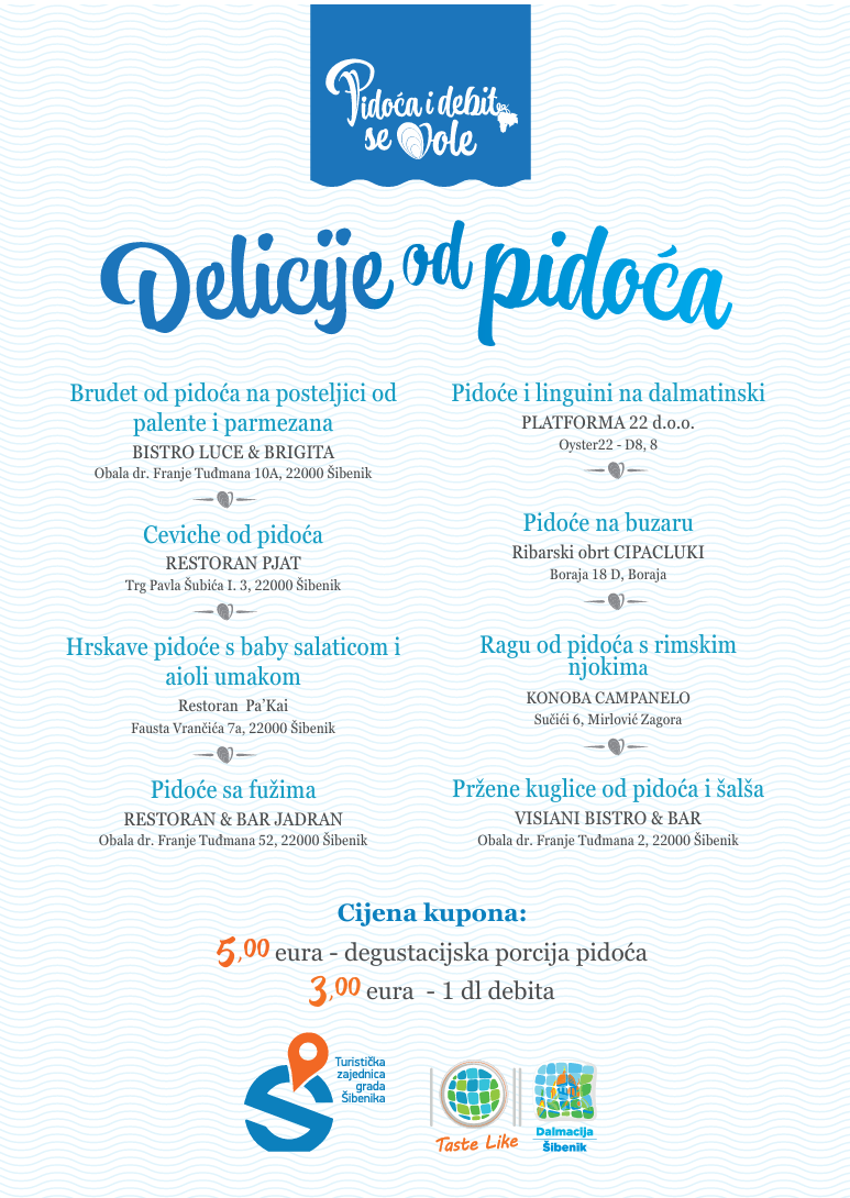 Na šibenskoj rivi, na Trgu Pavla Šubića I, u petak 14. lipnja, od 19 sati održat će se manifestacija ‘Pidoća & Debit se vole‘ gdje će te ponovno imati priliku kušati ovu skladnu kombinaciju i potvrditi da su zbilja idealan par!