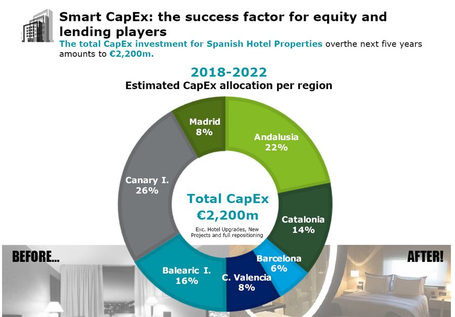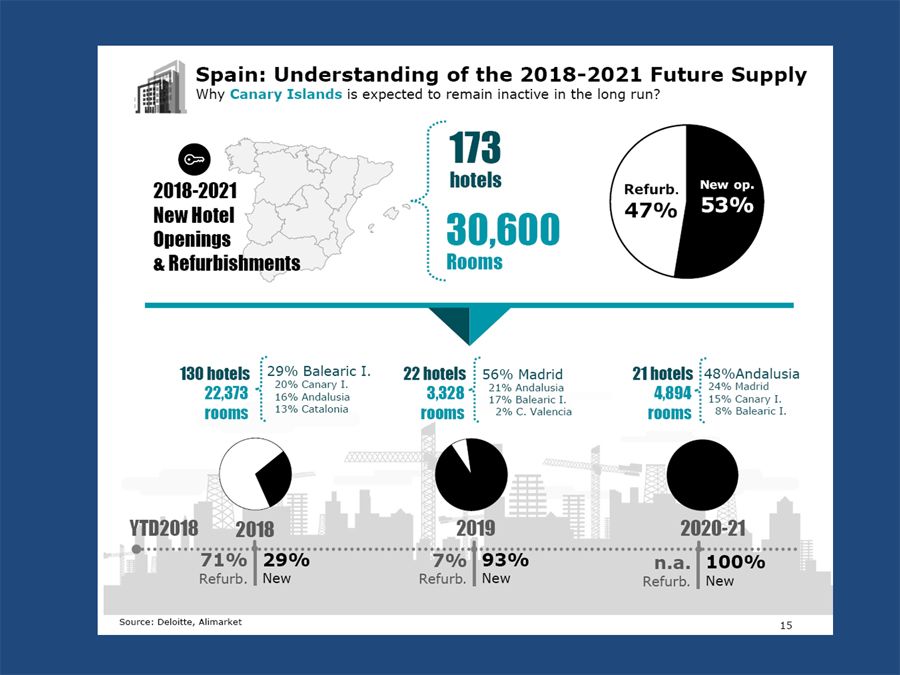 Tvrtka Deloitte predviđa otvaranje ili preuređenje oko 170 hotela do 2021. godine, s više od 30.000 soba, od kojih pola se preuređuje. Naime, više od polovice hotelskog pogona u Španjolskoj je starije dobi.