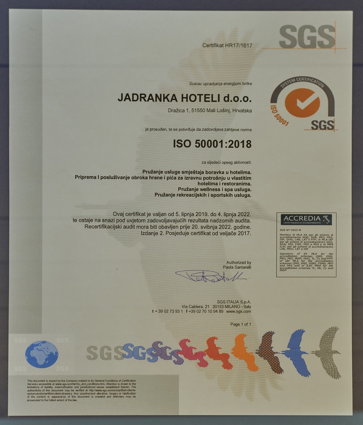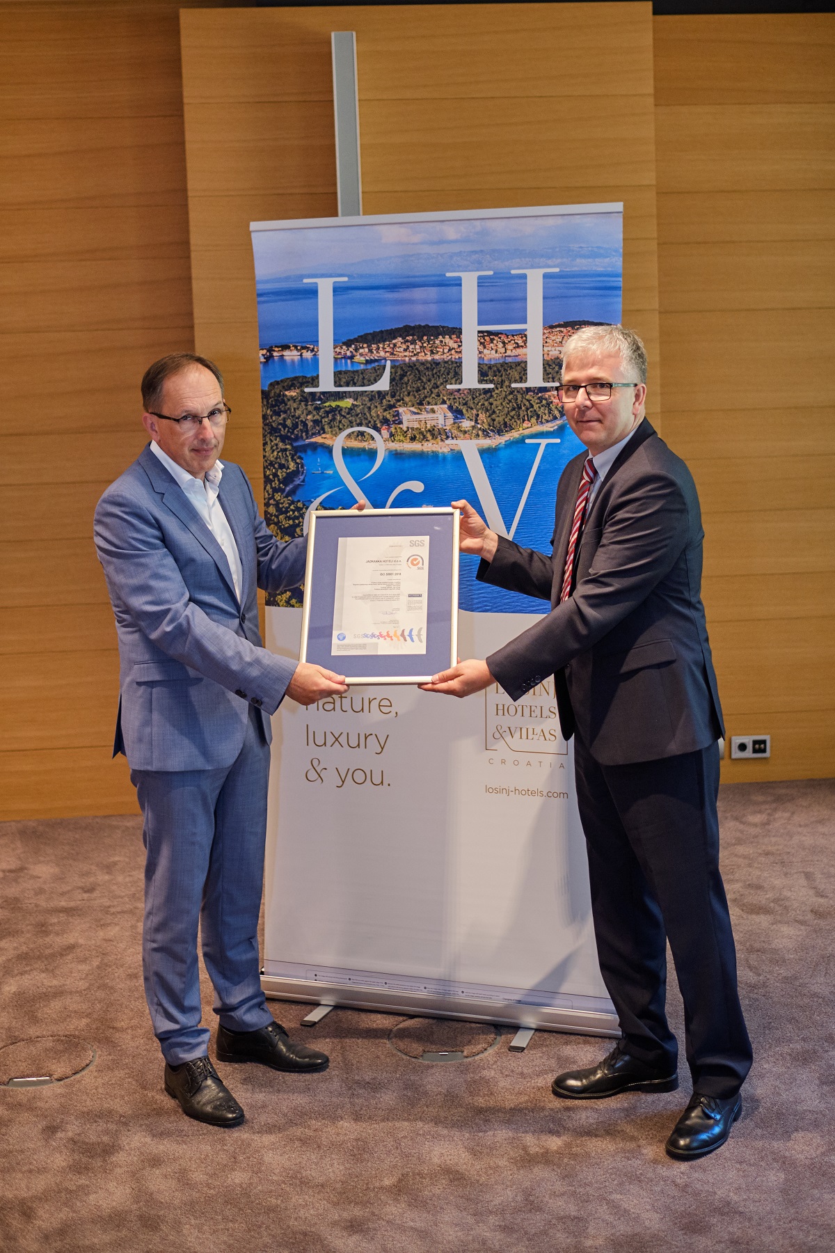 „Veliko nam je zadovoljstvo što danas možemo uručiti certifikat za sustav upravljanja energijom prema normi ISO 50001:2018. tvrtki Jadranka hoteli kao prvoj hotelijerskoj tvrtka u RH koja je svoje procese uskladila sa zahtjevima nove norme. Norma ISO 50001:2018 zahtijeva i osigurava poboljšanje energetskog učinka, smanjenje utjecaja na okoliš te postizanje kredibiliteta u komunikaciji prema javnosti, što u konačnici vodi zadovoljstvu gostiju, očuvanju okoliša i učinkovitom korištenju upravljanja energijom. Čestitamo upravi Jadranka hotela i svim zaposlenicima jer su certifikacijom dokazali svoju opredijeljenost ka društveno odgovornom poslovanju“– rekao je direktor odjela certifikacije tvrtke SGS Adriatica Drago Goić.