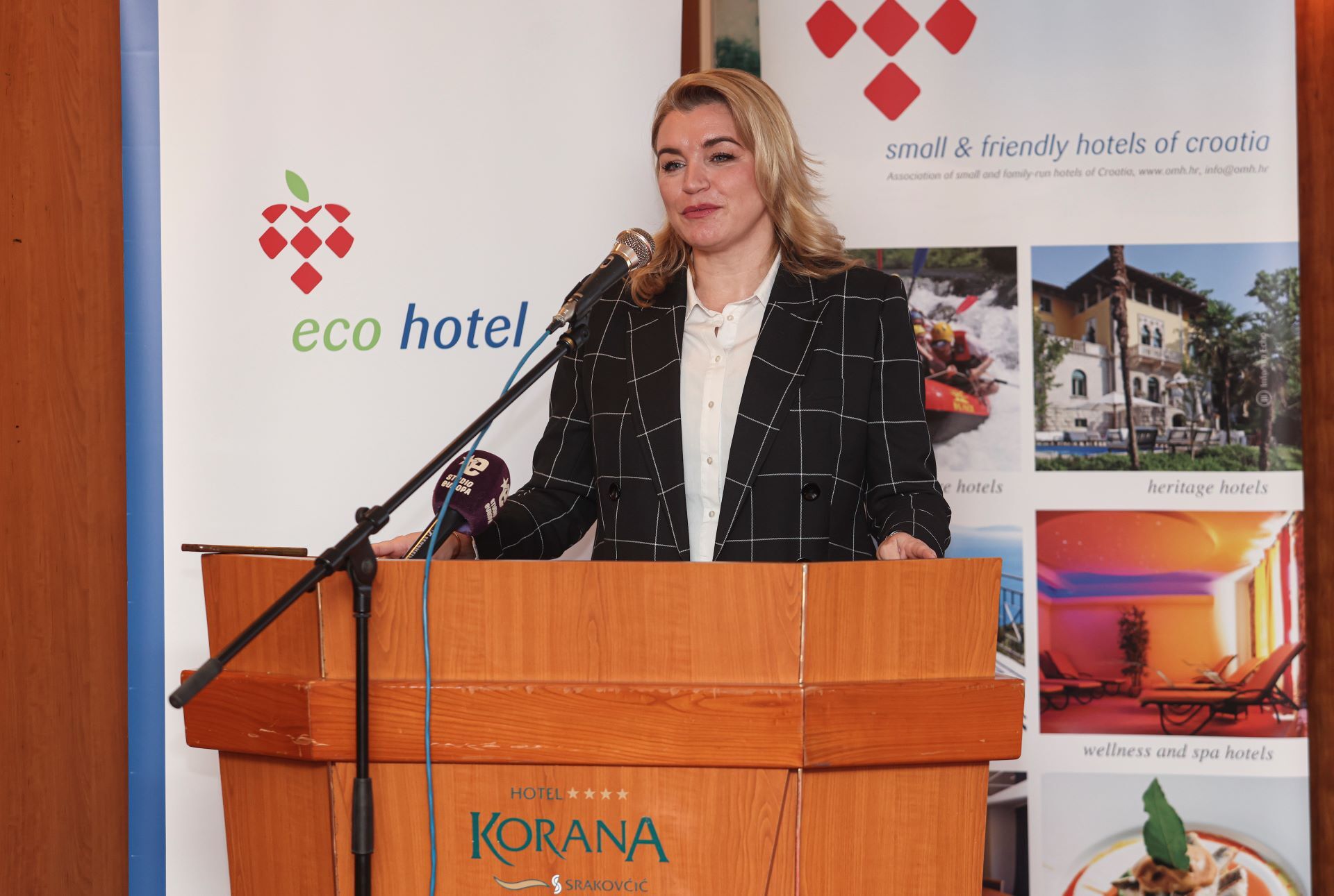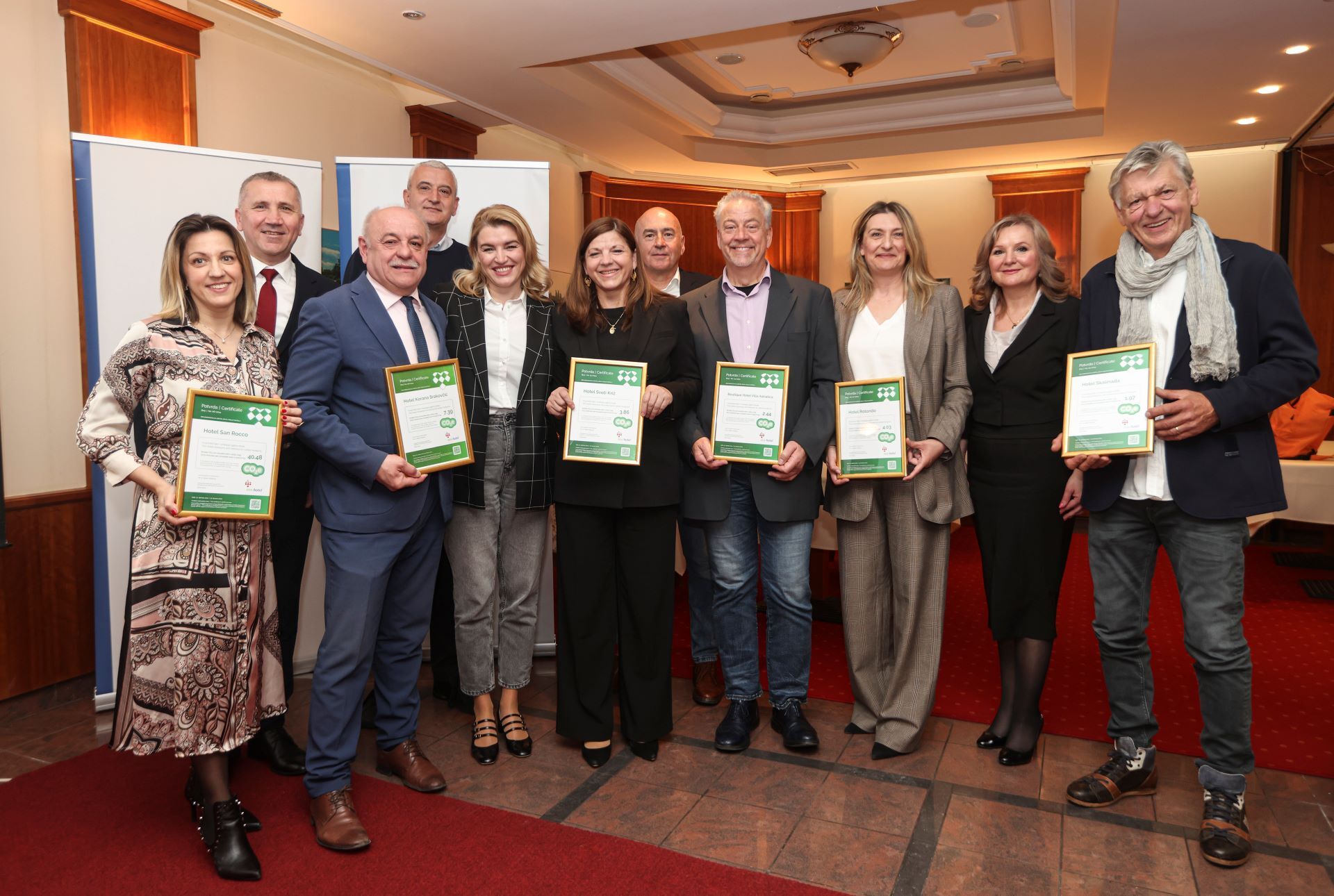 Karlovac, 22. ožujka 2024. - Ministrica turizma i sporta Nikolina Brnjac u karlovačkom hotelu Korana Srakovčić dodijelila je prvih sedam certifikata ugljičnog otiska članovima Nacionalne udruge obiteljskih i malih hotela. Hoteli Rotondo iz Segeta Donjeg, Sveti Križ iz Arbanije na Čiovu, Villa Adriatica iz Supetra na Braču, Skalinada iz Zavale na Hvaru, Spongiola s Krapnja, San Rocco iz Brtonigle i Korana Srakovčić iz Karlovca, predvodnici su u zelenog poslovanja u hrvatskom turizmu. Uz certifikat dobili su i naljepnicu koja potvrđuje da mjere i smanjuju ugljični otisak.