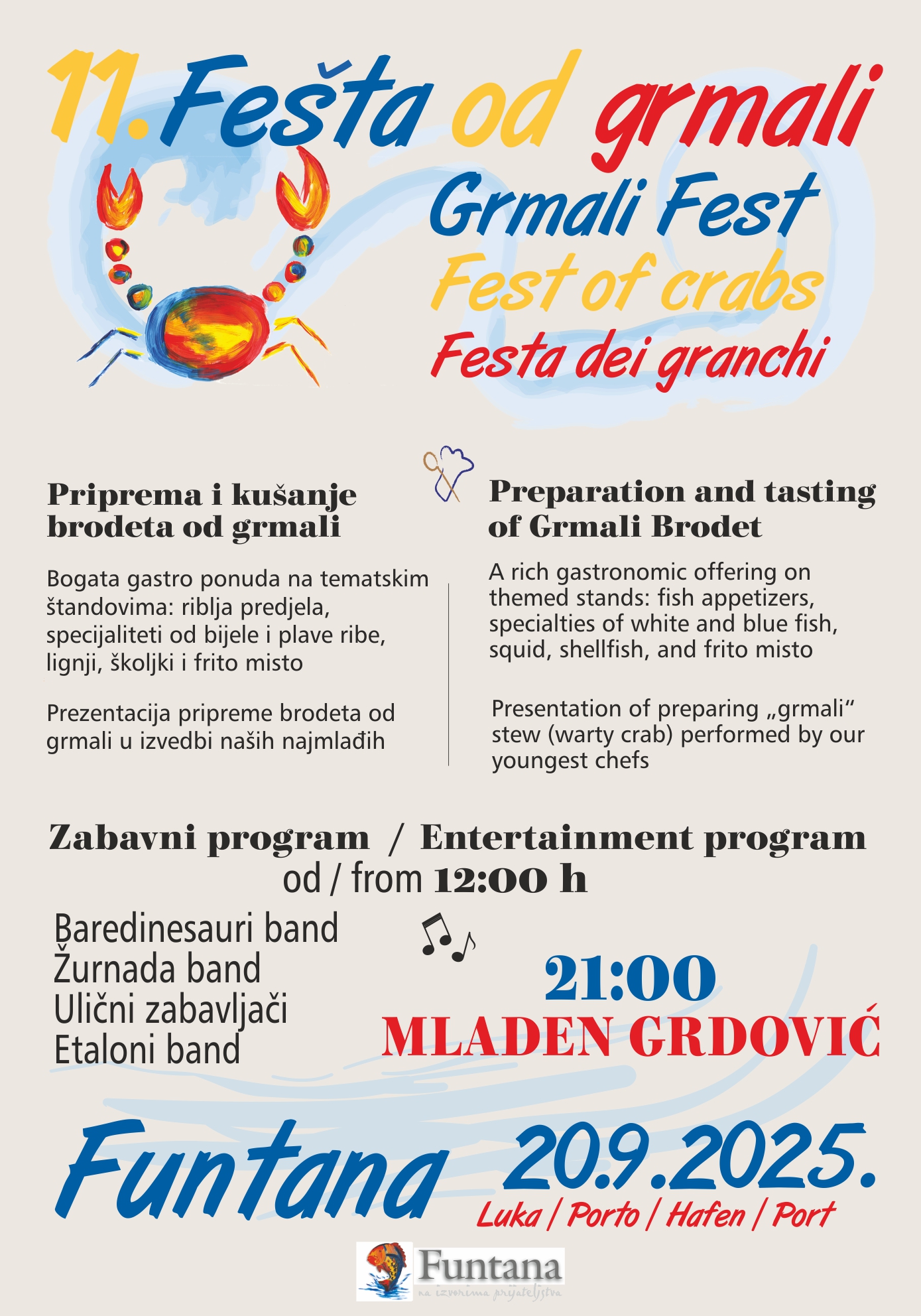 Feštu prati i bogat zabavni program: od 12 sati nastupaju Baredinesauri, Žurnada band, ulični zabavljači i Etaloni bend, a vrhunac večeri bit će koncert Mladena Grdovića u 21 sat.