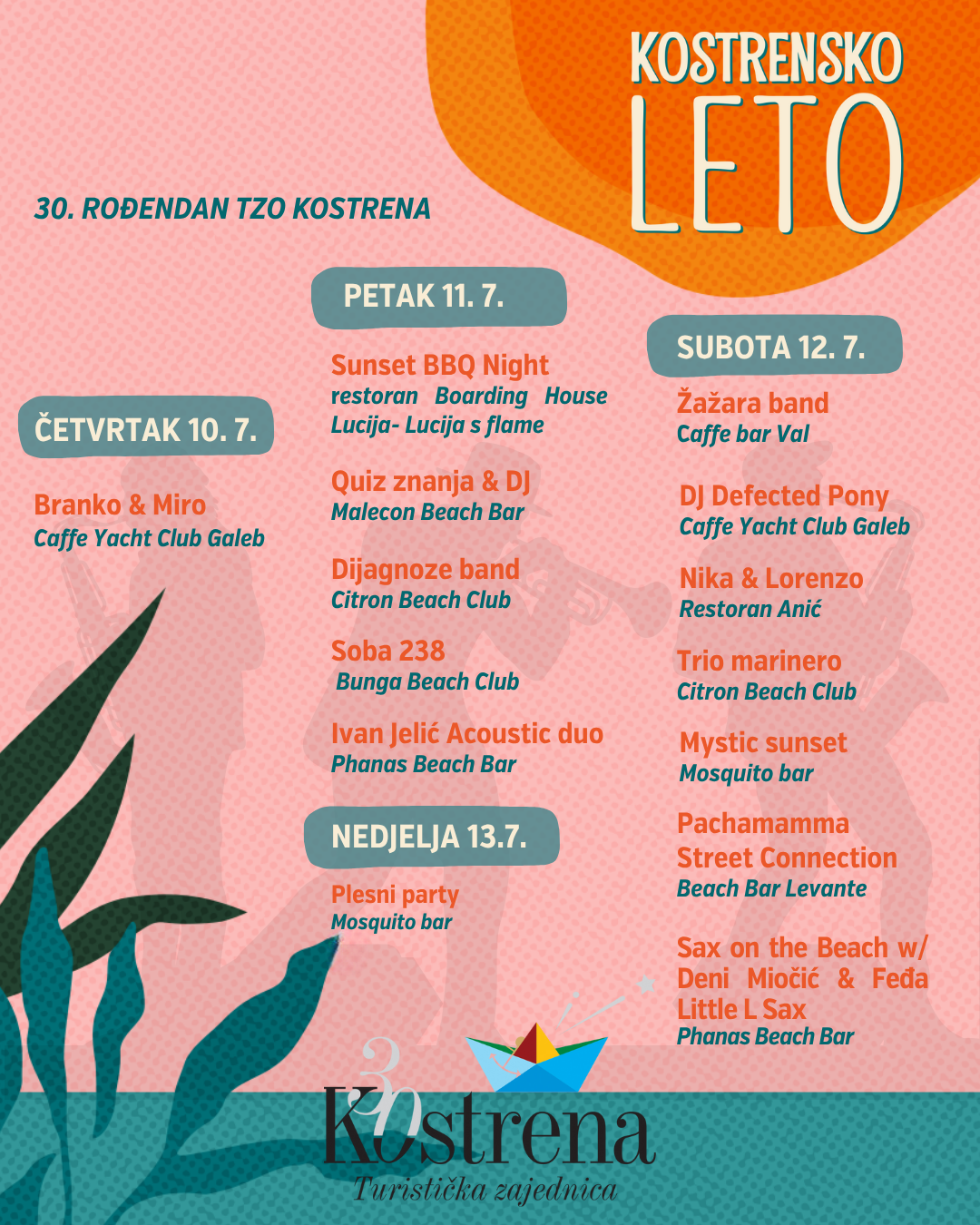 Najdugovječnija Kostrenska noć i sve popularniji festival Jedna noć u Kostreni očekuju nas već idući vikend. Rođendansko slavlje od 10. do 13. srpnja posvećeno je našim ugostiteljima – važnim partnerima u razvoju turizma. Zahvaljuju svima koji su se odazvali i vjeruju da će kostrenska šetnica od četvrtka do nedjelje biti ispunjena pjesmom, plesom i dobrom atmosferom! Svi programi su besplatni – prošećite šetnicom i uživajte u raznolikom programu za sve generacije!
