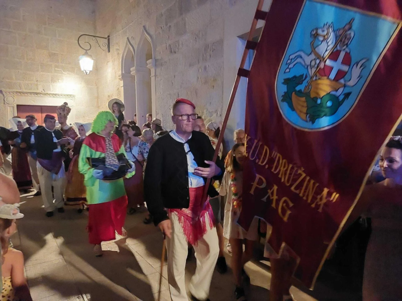 U petak, 26. srpnja 2024. karnevalska povorka kreće u 20.30 sati sa starog trajektnog pristaništa, donoseći veselu i šarenu karnevalsku atmosferu kroz grad pa sve do gradskog trga. Ova povorka savršen je uvod u večernji program i svečanu primopredaju vlasti koja će se održati u 21 sat i simbolizira početak karnevala. Prvo paško kolo u izvedbi Gradske glazbe Pag po tradiciji će povesti paški gradonačelnik, a nakon toga nastupit će „KUD "Družina" i oživiti bogatu povijest grada Paga. Posjetitelji će uživati u autentičnom prikazu lokalne kulture i folklora.