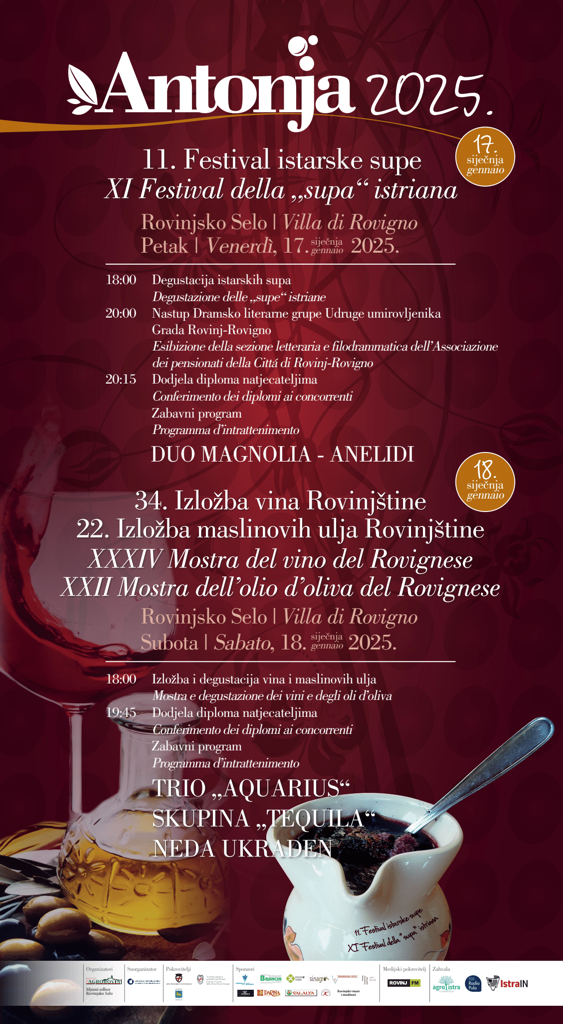 U Rovinjskom Selu održat će se 11. Festival istarske supe, 34. Izložba vina Rovinjštine i 22. Izložba maslinovih ulja Rovinjštine, manifestacije objedinjene u tradicionalnu Antonju.