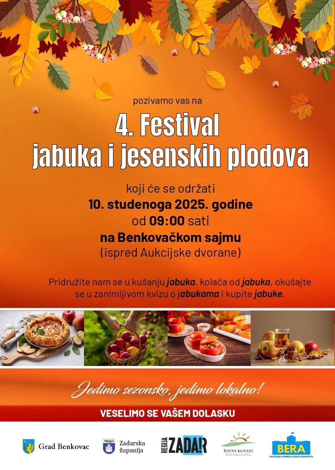 Pozivamo Vas da nam se pridružite na 4.festivalu jabuka i jesenskih plodova koji će se održati 10.studenoga 2025.godine od 9,00 sati na Benkovačkom sajmu (ispred aukcijske dvorane).