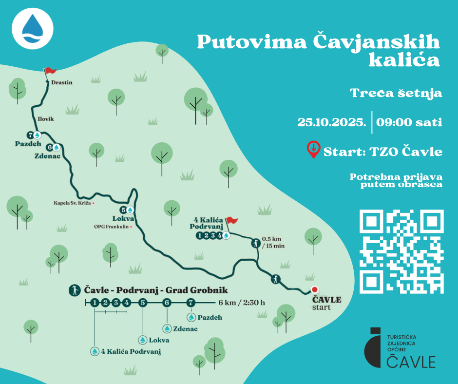 Turistička zajednica općine Čavle poziva sve zaljubljenike u prirodu na posljednju jesensku šetnju „Putovima Čavjanskih kalića“, koja će se održati u subotu, 25. listopada 2025. s početkom u 9 sati. Polazak je ispred ureda Turističke zajednice, a ruta vodi slikovitom stazom Čavle – Podrvanj – Grad Grobnik. Šetnica duga 6,5 kilometara i oko 2,5 sata hoda u jednom smjeru pruža priliku da se doživi krajolik ispunjen obnovljenim kalićima i ljepotom grobničke prirode, uz stručno vodstvo i zanimljive priče s terena.