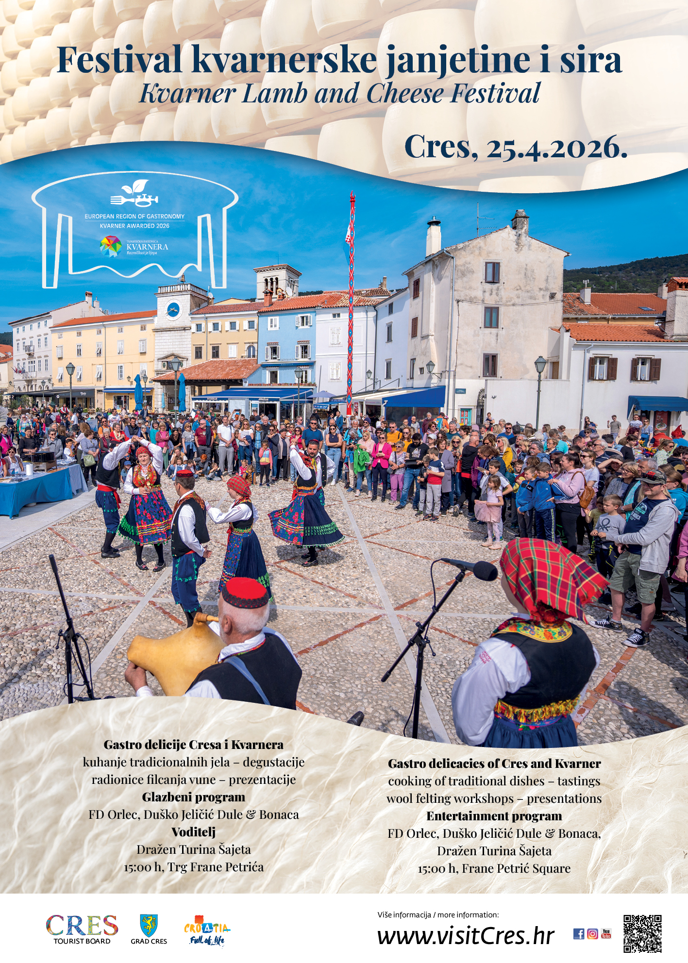 Organizatori Festivala kvarnerske janjetine i sira Turistička zajednica Grada Cresa i Turistička zajednica Kvarnera pozivaju sve ljubitelje dobre hrane, tradicije i otočnog ugođaja da ovog vikenda posjete Cres i dožive autentične okuse Kvarnera.